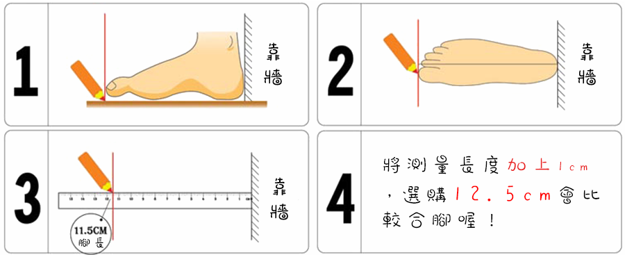 加上一公分選擇尺碼,例如長度為 11.5 則選購 12.5 公分的鞋子