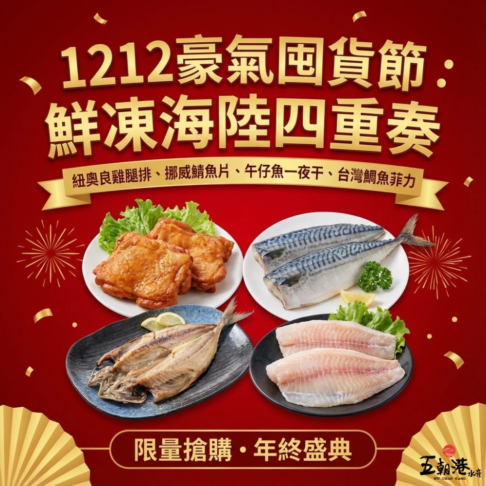 【雙12優惠組合】1212豪氣囤貨節:鮮凍海陸四重奏 (紐澳良無骨雞腿排2片+極鮮巨厚挪威薄鹽鯖魚2片+台灣頂級午仔魚一夜干3尾+尚鮮台灣鯛魚菲力3片) 海鮮 生鮮 現撈 家常菜 快速到貨