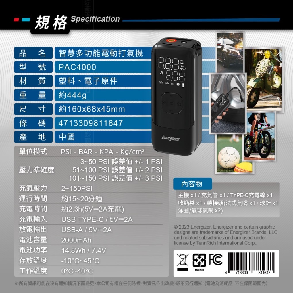- 【Energizer 勁量】- PAC4000 智慧多功能電動打氣機