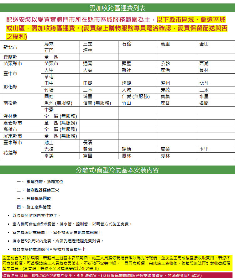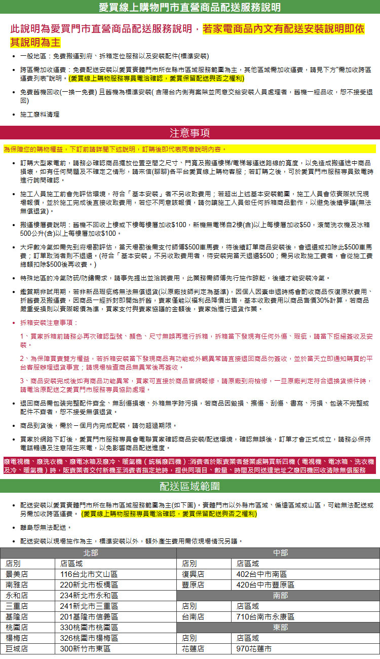 1. 配送安裝以愛買實體門市所在縣市區域服務範圍為主。實體門市以外縣市區域(宜蘭縣市、雲林縣、嘉義縣市、高雄縣市、屏東縣市、臺東縣市...等),及實體門市所在縣市區域內偏遠區域或山區,可能無法配送或另需加收跨區運費。(愛買線上購物服務專員電洽確認)