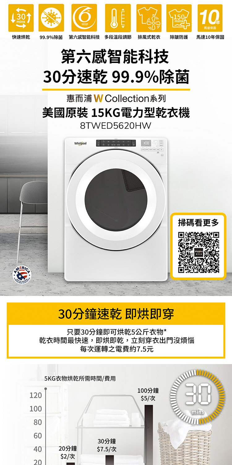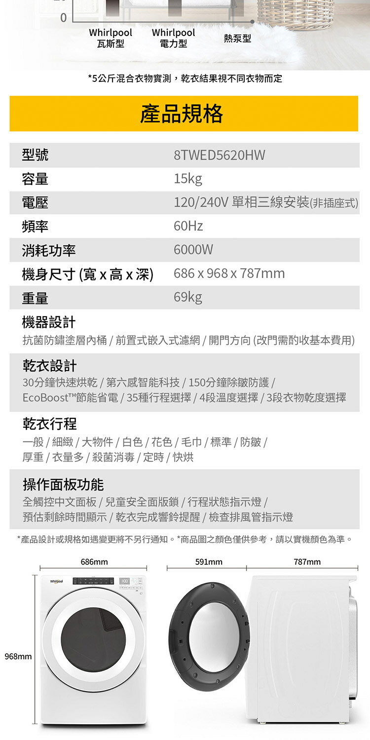 6. Whirlpool惠而浦15KG電力型滾筒乾衣機8TWED5620HW_含配送+安裝【愛買】