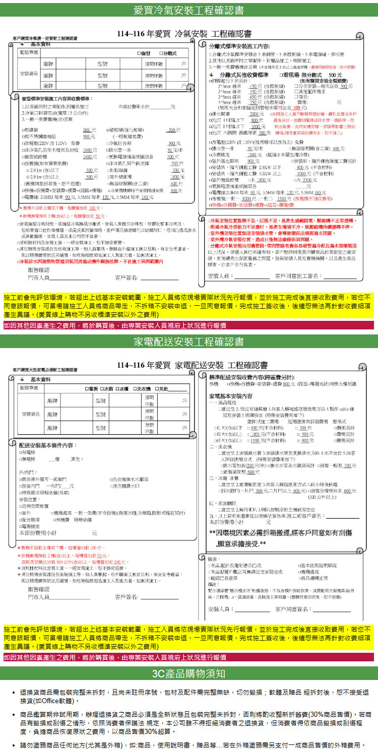 • 廢四機回收說明:「新購公告指定規格之電視機、洗衣機、電冰箱或冷、暖氣機時,販賣業者應提供同項目、數量、時間及同送達地址之廢四機回收(搬、載運)無償服務。但不包含為搬運、拆卸而動用大型機具、工程或危險施工等。請於交付廢四機時向業者索取回收聯單。消費者本人簽名確認已被口頭告知或知悉上述權益」。