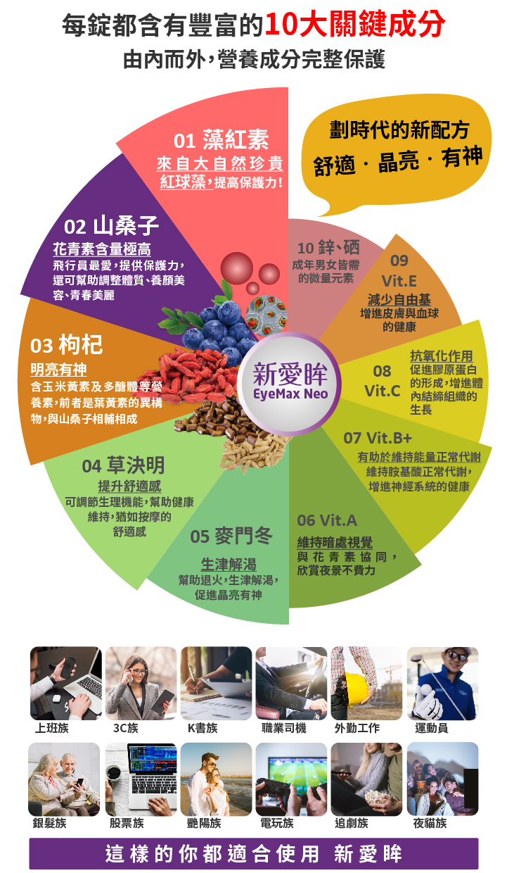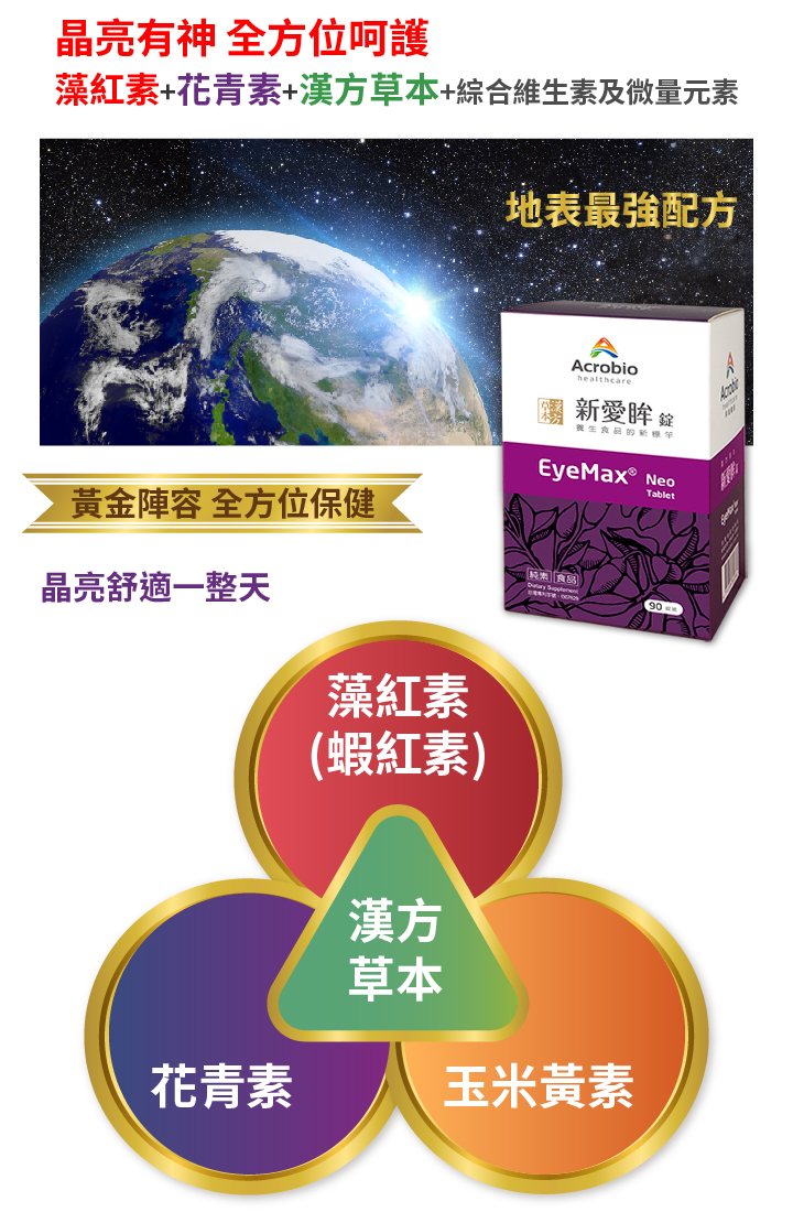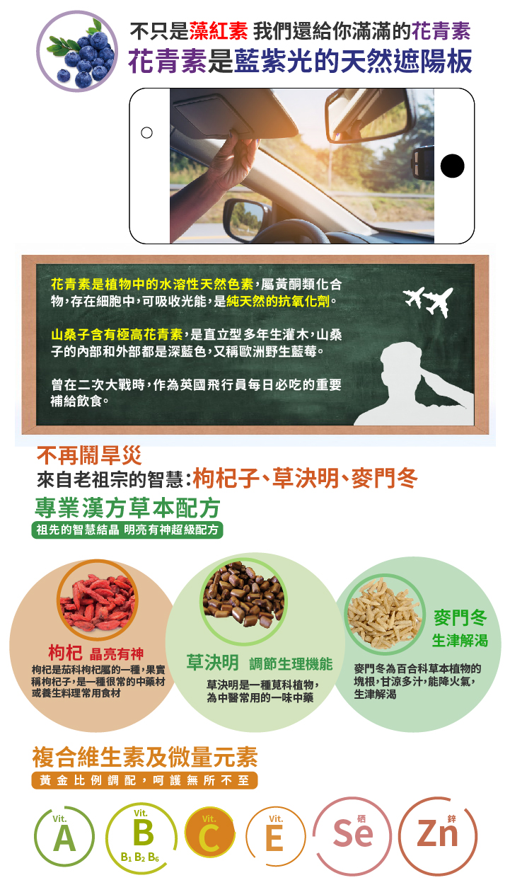 A:新愛眸捨棄高知名度的葉黃素,而選用價格昂貴的藻紅素(亦稱蝦紅素),因藻紅素親水性佳,不會造成身體負擔。 新愛眸同時添加了高純度山桑子,提供了高劑量的花青素;此外還添加專利配方,枸杞子、草決明、麥門冬等,可當食品,兼具親水、親油特性。以及維他命A、C、E,及β-胡蘿蔔素和微量元素葡萄糖酸鋅、硒酵母,防護機轉更全面,健康加倍!