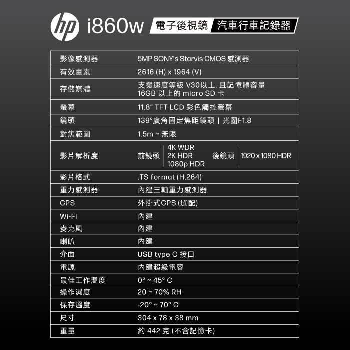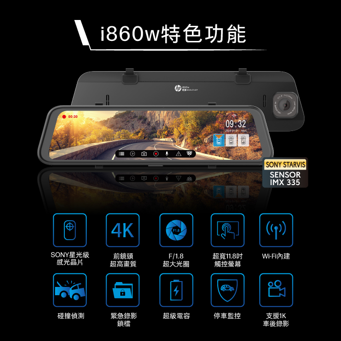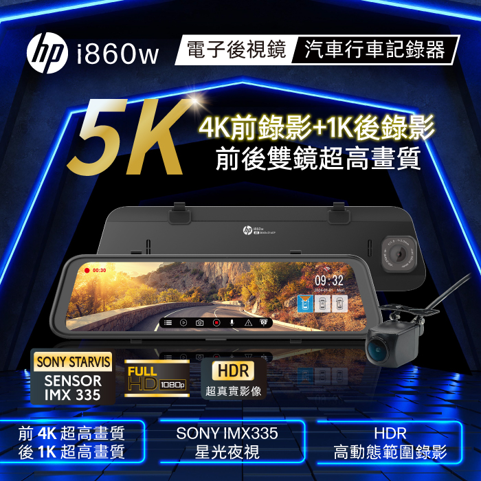 HP 惠普 i860w 5K畫質電子後視鏡|WIFI|行車紀錄器|前後雙錄|GPS|支援OTA雲端韌體更新|APP下單享4%回饋|