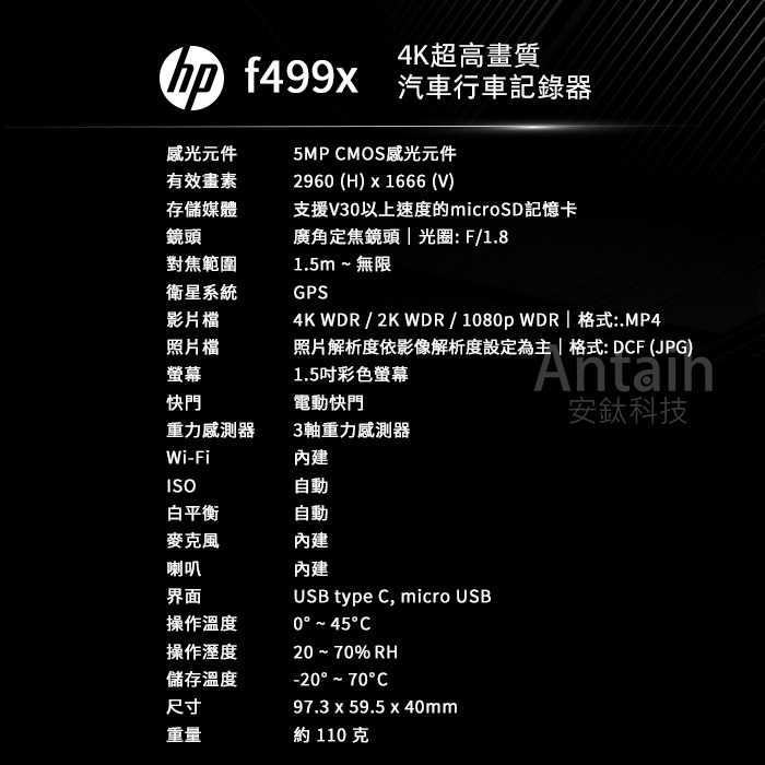 雙錄版 HP惠普 F499x 雙錄+測速 4K超高畫質美型迷你機身|1.5吋螢幕|OTA|WIFI|行車記錄器