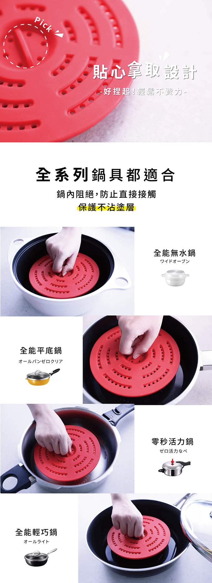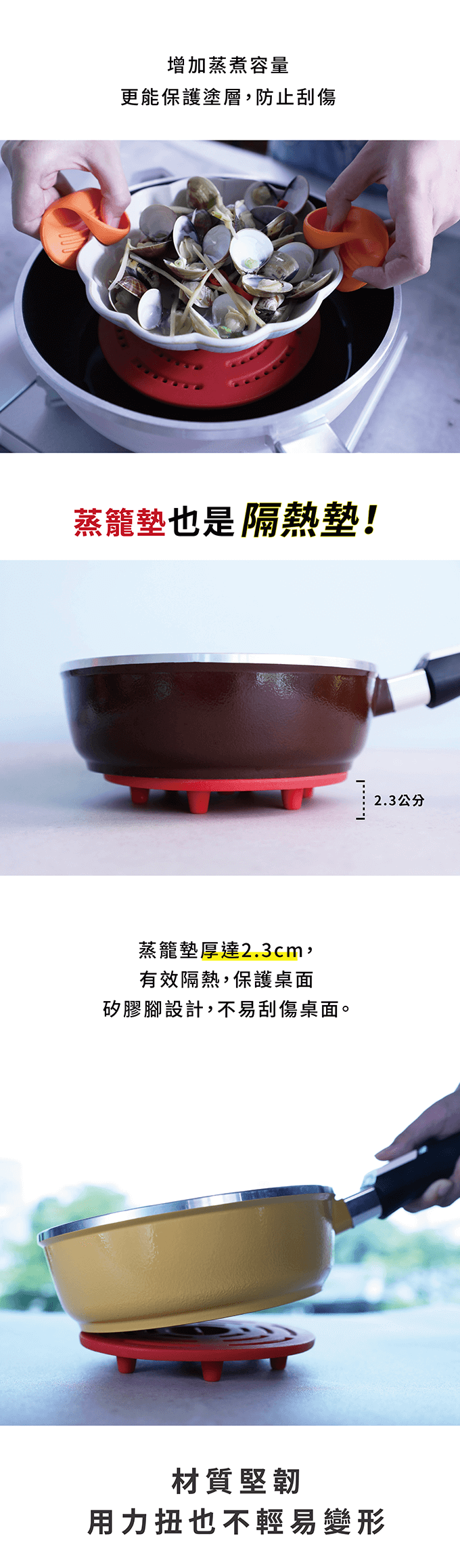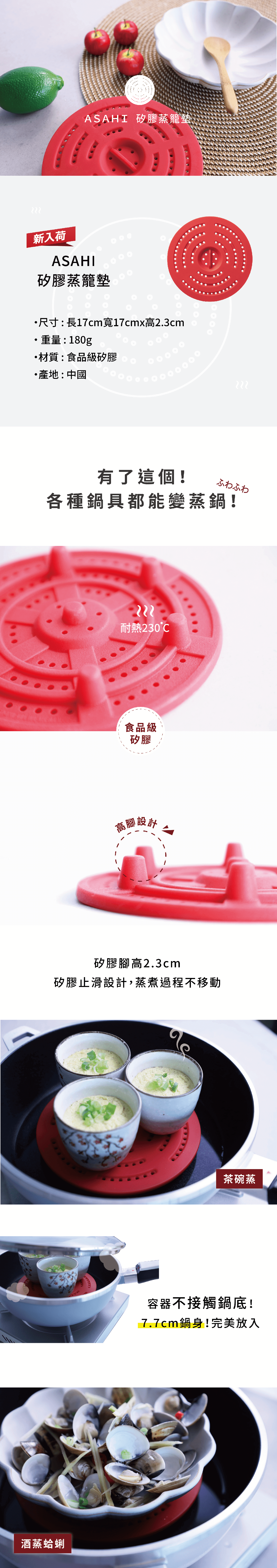 矽膠蒸籠墊_規格 .材質:食品級矽膠 .尺寸 :長17cm x 寬17cm x 高2.3cm .重量:180g .耐熱溫度:230度 .製造:日本原廠設計,中國代工廠製造,符合日本食器安全規範,每一支均通過日本原廠嚴格品檢。