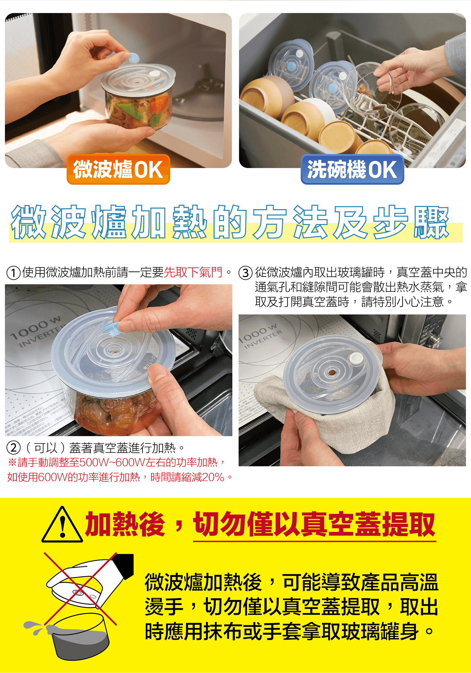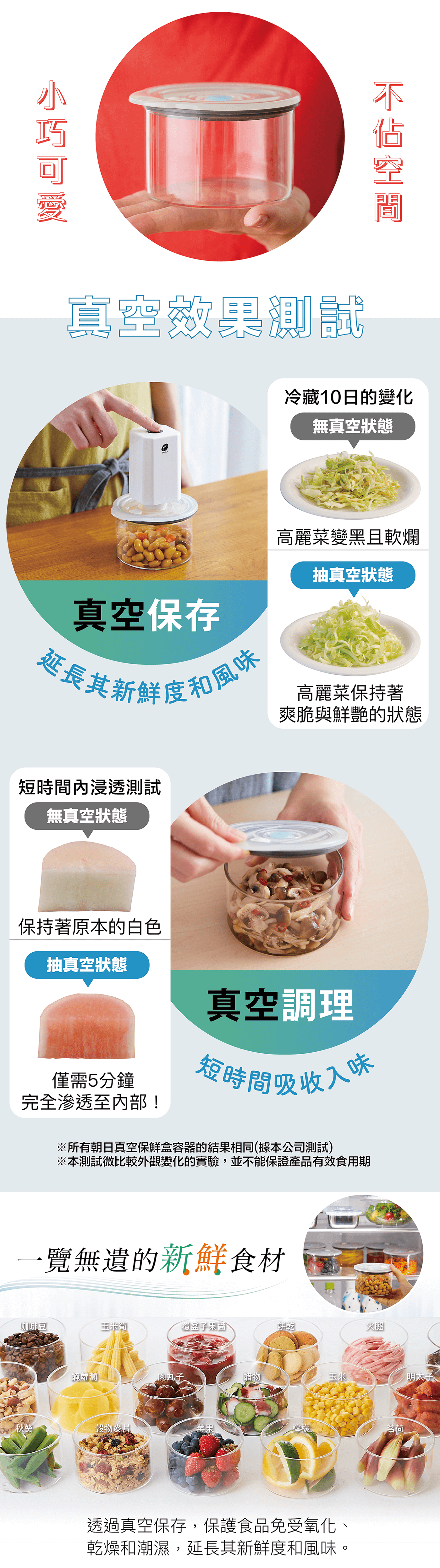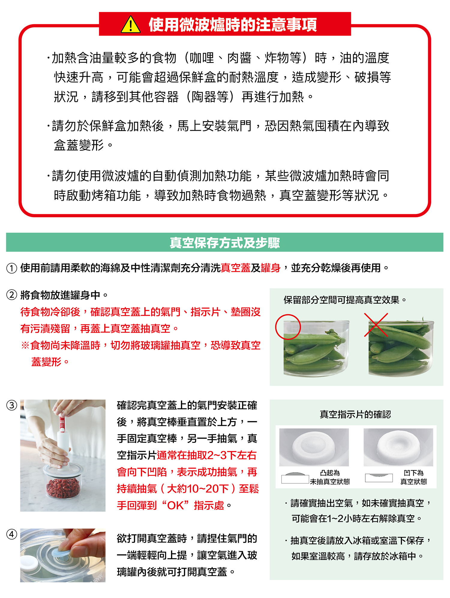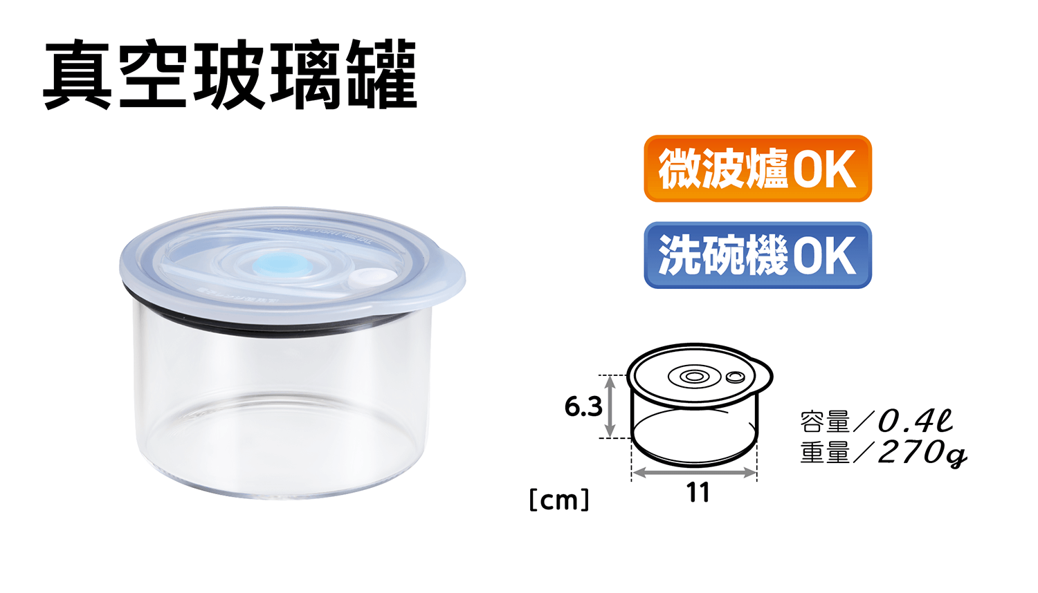 真空玻璃罐 .材質/罐身本體:耐熱玻璃、真空盒蓋:聚丙烯PP、氣門.指示片.墊圈:食品級矽膠 .尺寸/直徑11x高6.3cm .重量/270g .容量/0.4L .耐熱溫度/本體500度、真空蓋120度 .耐冷溫度/-20度(不可冷凍) .容器的耐熱溫度差(在急速加熱或急速冷卻時不會破裂的溫度差)/ 120度 .製造/台灣製 .附產品說明書※容器的高度、重量均包含真空蓋