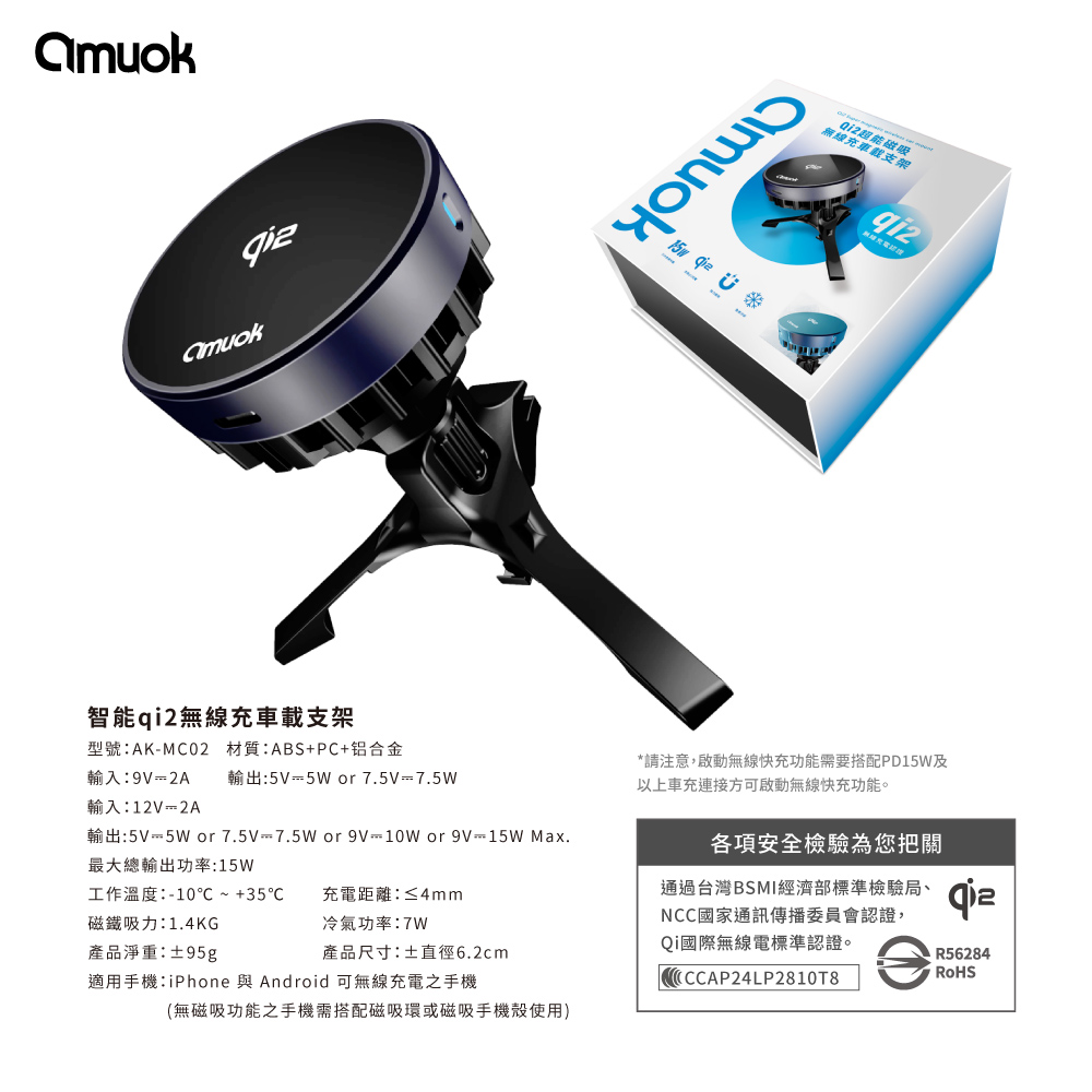 6. 【amuok】Qi2超能磁吸無線充車載支架(散熱款) BSMI認證 車用無線充電 磁吸手機支架