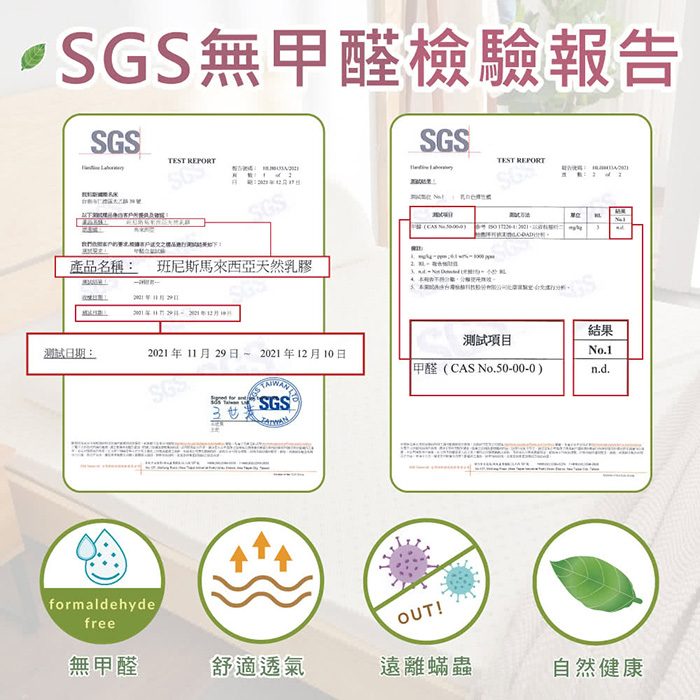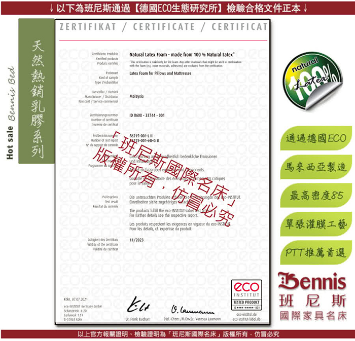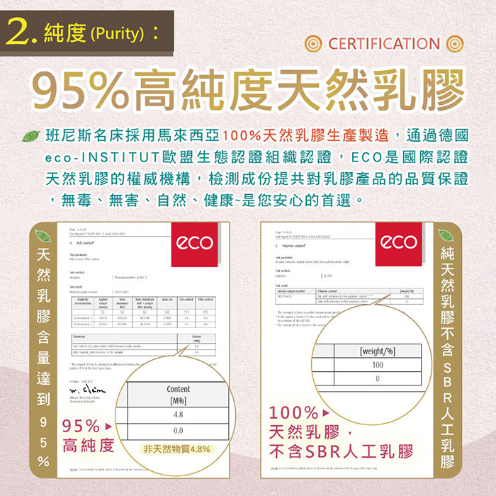 ‧【馬來原廠送檢德國ECO檢測成品膠含量約90%、膠含量內為100%天然乳膠( NR=Natural Rubber )、0%人工乳膠(SBR)】