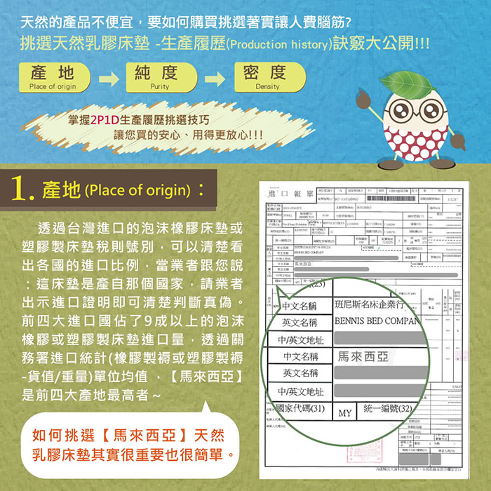 ※標榜德國或歐美進口的乳膠並非就是品質保證,常見拿歐美做招牌內容物卻是PU化學合成乳膠,天然製品最好依專業機構所測量乳膠含量及密度來判斷優劣與否;當然舒適度是最重要的一環唷^^