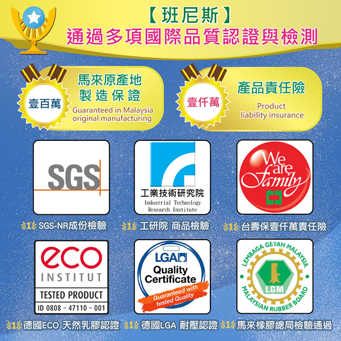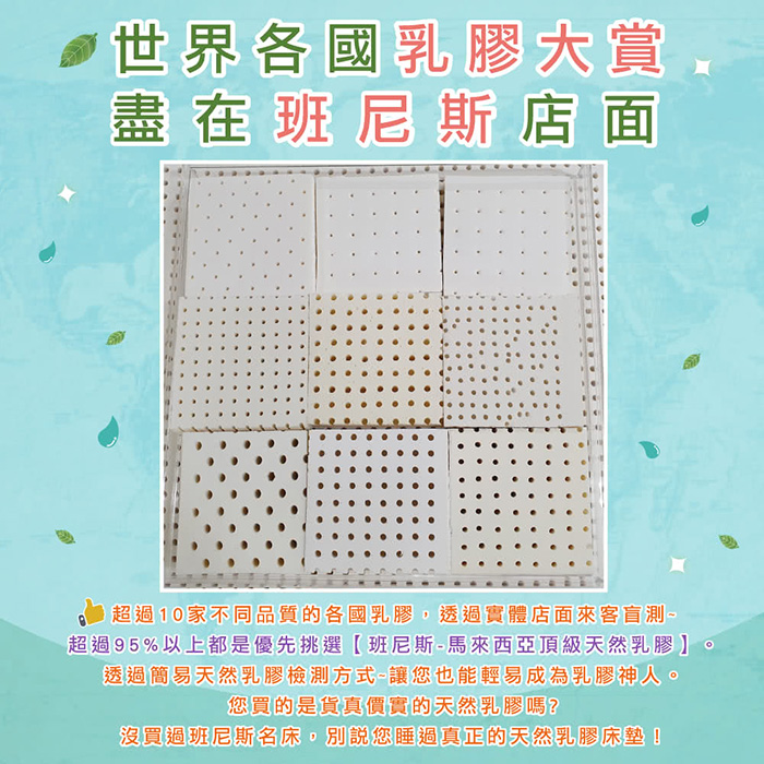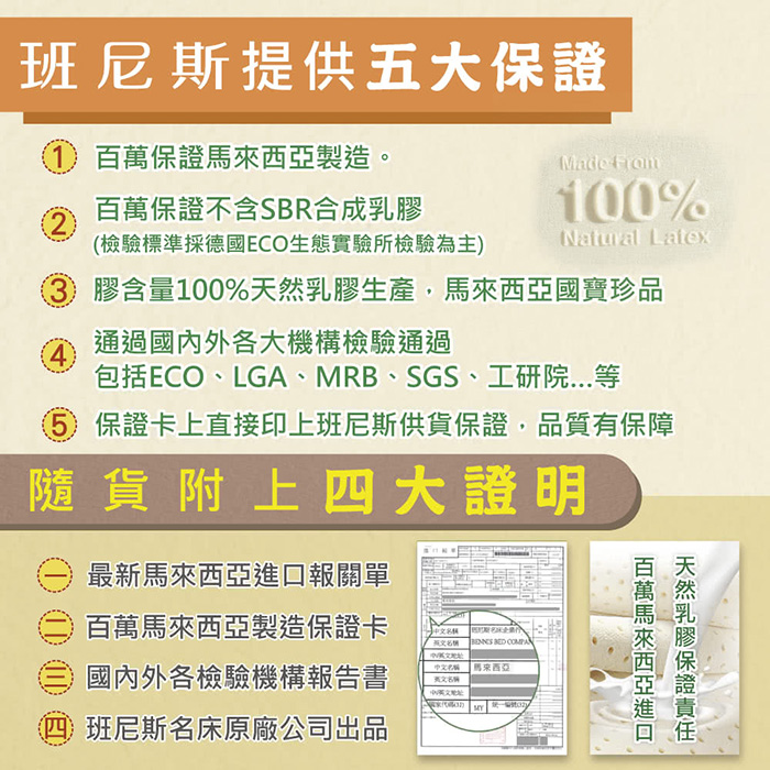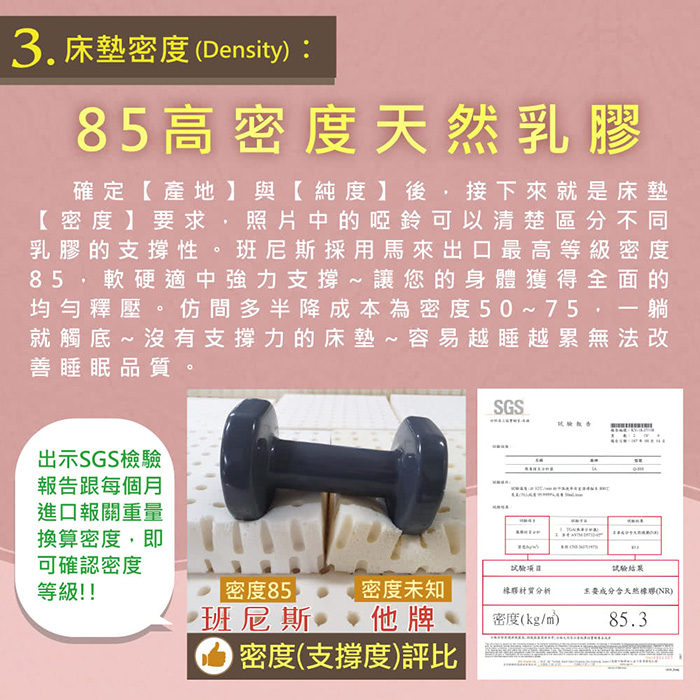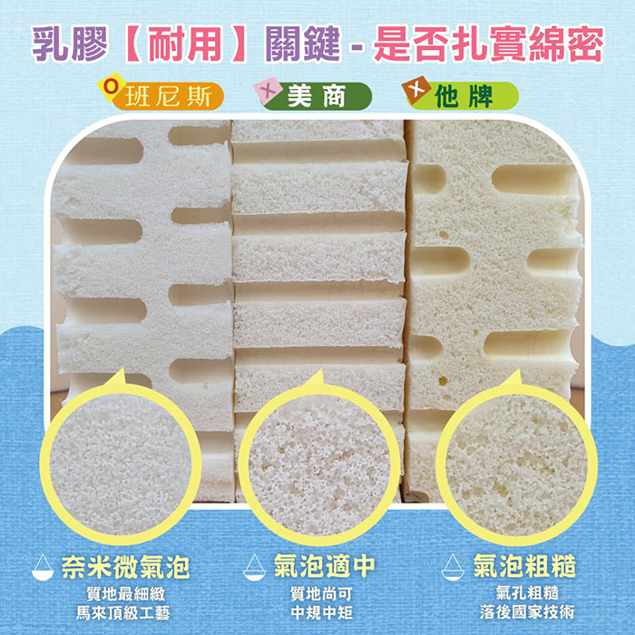 『班尼斯天然乳膠純度高、品質佳,軟硬適中,支撐力及壽命佳』