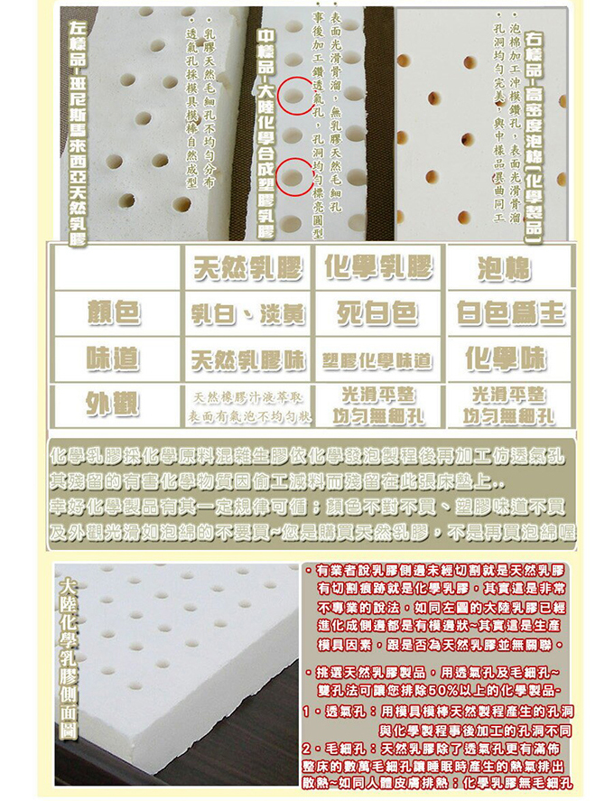 1、純度:利用照片中的雙孔法判斷,可讓您排除市場上 50%以上的化學乳膠製品。顏色太白不買、塑膠味道不買、表面光滑不買、用布套密封床墊讓您看不到也不要購買,更不要看到外觀漂亮如泡棉就覺得是極品,自己要能判斷。