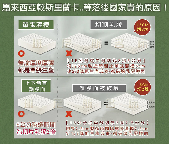 3、厚度:天然乳膠原料成本取得耗時昂貴,一張15公分的乳膠床墊需採集上百顆橡膠樹汁液三天。所以確保厚度及尺寸的足夠是消費者應有的權益,不要聽信業者偷工減料的說法唷^_^