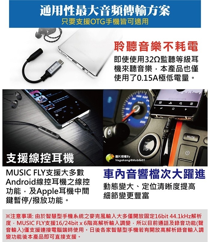 3.MUSIC FLY以聆聽高解析音樂使用為主,雖有支援聲音輸入的隱藏功能,但由於智慧型手機系統之麥克風輸入大多僅開放固定16bit 44.1kHz解析度,MUSIC FLY支援16/24bit x 6階高解析輸入調變,所以目前通話及錄音功能(聲音輸入)僅支援連接電腦端時使用,日後各家智慧型手機若有開放高解析錄音輸入調變功能後本產品即可直接支援,實並非本產品所能控制還請見諒。