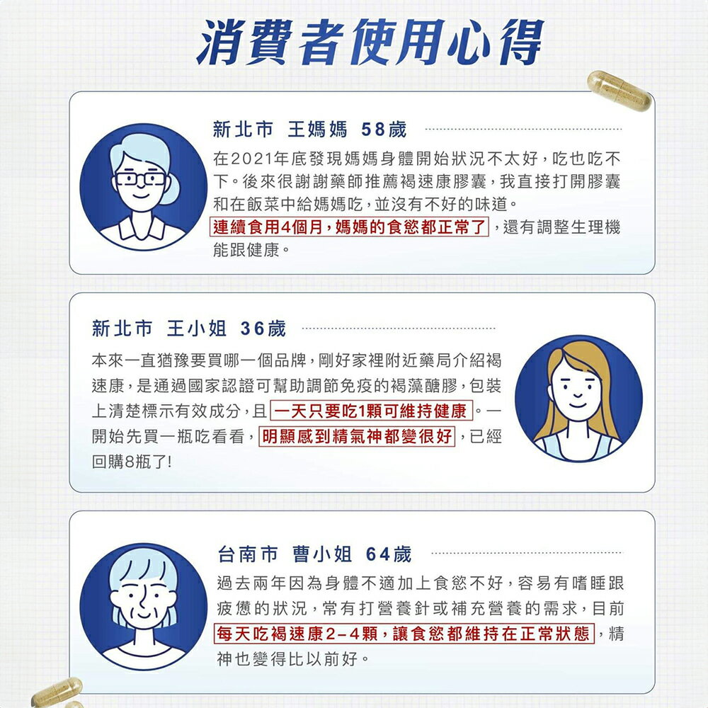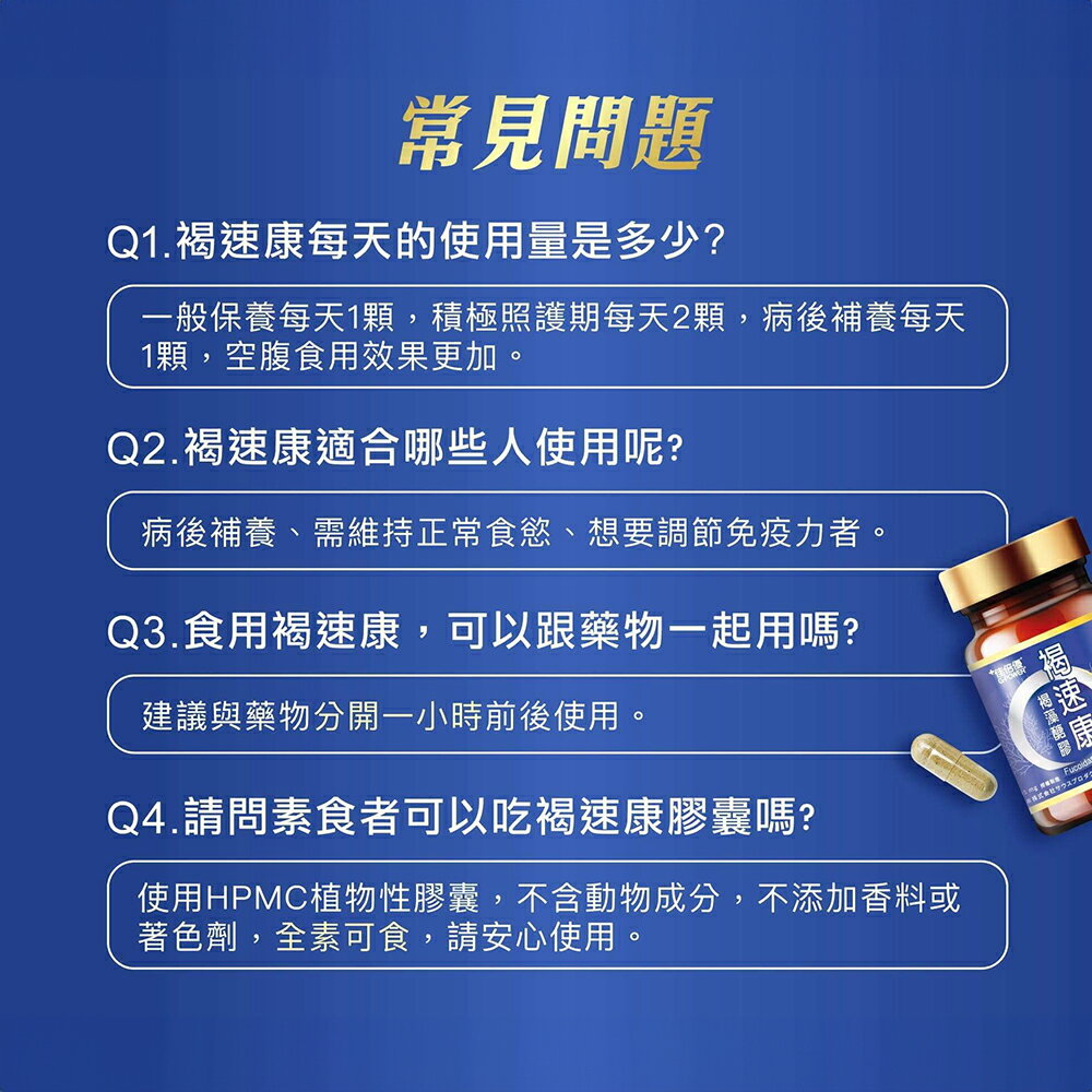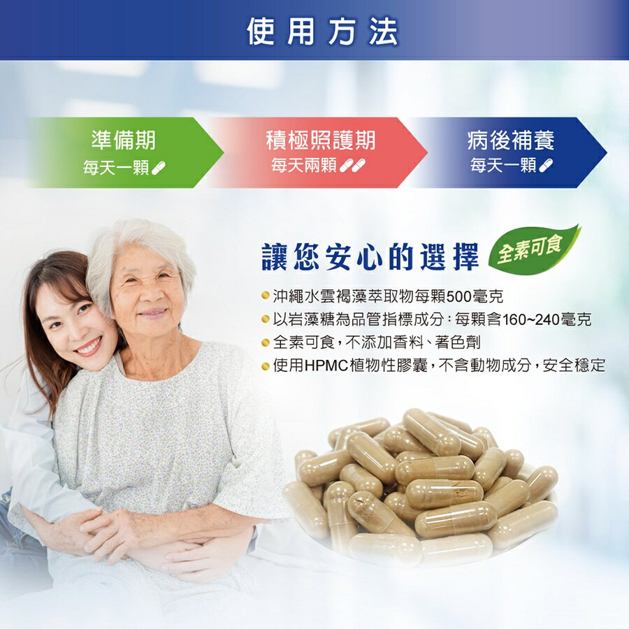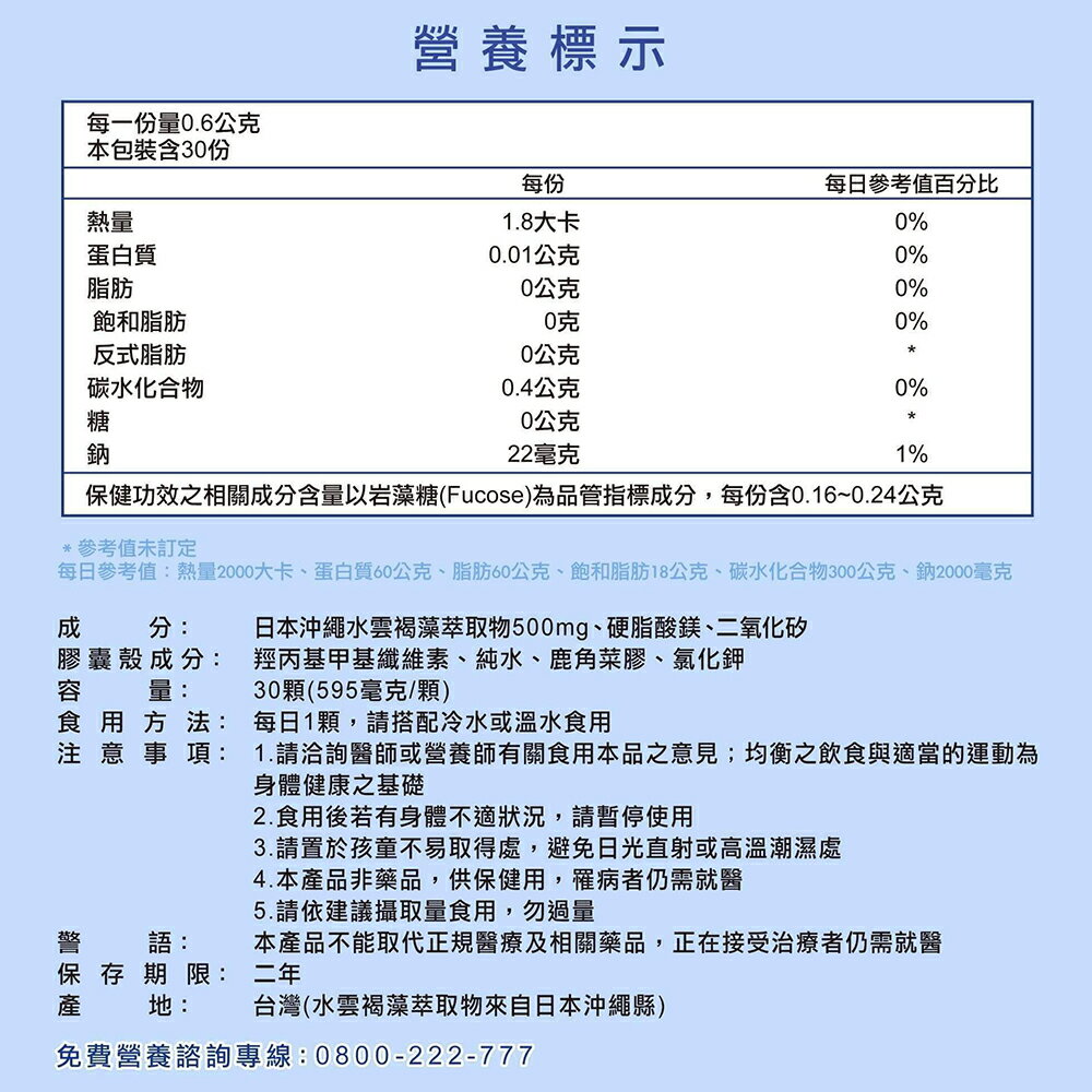 專科醫師推薦,國家健康食品認證。沖繩特有"水雲褐藻",褐藻醣膠含量最高,定性定量功效成分"岩藻糖"。國家認證,長期使用調節免疫力,原料、技術、包裝嚴格把關,全素可食。 商品名稱:佳倍優 褐速康 褐藻醣膠膠囊 主要成分:日本沖繩水雲褐藻萃取物500mg、硬脂酸鎂、二氧化矽 食用方式:每日1顆,請搭配冷水或溫水食用;準備期每天一顆、積極照護期每天兩顆、病後補養每天一顆。 商品產地:台灣(水雲褐藻萃取物來自日本沖繩縣) 商品給格:30顆(595毫克/顆) 保存期限:2年 商品貨源:原廠公司貨 『注意事項』 ⭐️本賣場出貨皆為新品,「物流配送過程中難免受到擠壓,」若不能接受者,歡迎到實體門市選購。 ⭐️「拆封包裹時請錄影存證,如發現異常,請勿自行拆封商品包裝並直接通知我們,我們會與原廠替您做後續處理。」 ⭐️所有商品不開放試用,一經開封將影響您退貨權益。 ⭐️拆封包裹若有發現異常,請即時拍照存證並通知我們。 ⭐️下標視同同意以上購物前須知。
