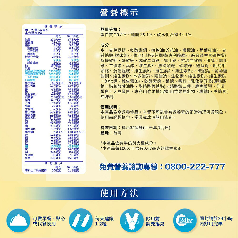 維維樂佳倍優的鉻100配方。各大醫學中心指定使用,超過千位醫學人士認同,國家認證營養師調配。有助維持醣類代謝(鉻、鋅),B1、精胺酸配方有助維持心臟功能,高鈣500有助於維持骨骼健康。內含維生素C有助傷口癒合,醫學營養雙科推薦,添加專利山竹果抽出物。零膽固醇,低鈉。奶素可食。 商品名稱:維維樂 佳倍優 鉻100 3EX 強化配方 商品口味:鉻100 3EX 強化配方無糖 商品規格:237ml/罐。,24罐/箱(無贈罐) 適用對象:銀髮族群、病後補養、需增體力、上班族群、營養不足。 有效期限:12個月 商品產地:台灣 商品成分: 水、麥芽糊精、乾酪素鈣、植物油(芥花油、橄欖油、葡萄籽油)、麥芽糖醇(甜味劑)、難消化性麥芽糊精、綜合維生素礦物質(檸檬酸鉀、碳酸鈣、磷酸二氫鈣、氯化鈉、抗壞血酸鈉、肌醇、氧化鎂、牛磺酸、葉酸、維生素E、焦磷酸鐵、硫酸鋅、鉻酵母、吡啶甲酸鉻、菸鹼醯胺、維生素K1、維生素A、維生素B12、硫酸錳、葡萄糖酸銅、維生素D2、本多酸鈣、硒酸鈉、生物素、維生素B1、維生素B6、碘化鉀、維生素B2)、乾酪素鈉、菊糖、香料、乳化劑(乳酸硬脂酸鈉、脂肪酸甘油酯、脂肪酸蔗糖酯)、磷酸氫二鉀、鹿角菜膠、乳清蛋白、大豆蛋白、專利山竹果抽出物(山竹果抽出物、糊精)、蔗糖素(甜味劑)。 『注意事項』 .配送方式請選擇『宅配』。 .訂購前請先店長客服,感謝您的配合。 .建議每日1-2罐,可做早餐、點心或代餐使用。 .未開封前可置於乾燥陰涼處保存。 即開即飲,亦可冰涼後使用。若需溫熱使用時,請隔水加熱,但勿煮沸。 .本品為高營養食品,久置下可能會有營養素的正常物理沉澱現象, 使用前請搖勻後使用。未食用完請加蓋冷藏並於24小時內食用完畢。 .本產品含有牛奶、大豆成分。