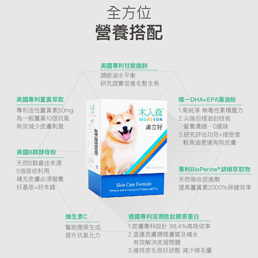 ⭐️木入森犬寶膚立好,打造狗狗皮膚保健層層防護網。全方位營養搭配,調節皮脂分泌與皮膚乾燥,皮膚過敏舒緩,減輕搔癢等皮膚刺激,維持皮膚正常功能。適合「需調理膚質營養加強」、「正值皮膚問題困擾」的狗狗。 🎈 獨家新成分,藻油粉增添 DHA + EPA,皮膚營養加成 🎈高達 98% 適口性,使用天然食源,美味健康兼併 🎈養成黃金 3 要素,促進皮膚健康有訣竅 1. 抵抗力:細胞提高免疫力,保護皮膚維持功能 2. 保水力:皮膚保有水分,調理膚質過油與乾燥 3. 代謝力:促進代謝排毒素,減緩癢覺及過敏舒緩 商品名稱:木入森 犬寶膚立好 主要成分:魚胜肽膠原蛋白、酵母粉(含維生素B群)、藻油粉(含EPA、DHA)、薑黃萃取粉(含薑黃素)、維生素C、甘胺酸鋅、麥芽糊精、胡椒萃取物(含胡椒鹼)。 餵食方式:可混合飼料食用或溶於水中飲用。狗狗小於 10kg:1包 / 日。狗狗大於 10kg:2包 / 日,分兩餐餵食。 商品產地:台灣 商品規格:500毫克/粒,30粒/盒,60粒/盒 商品貨源:原廠公司貨 保存期限:三年 『注意事項』 ⭐️本賣場出貨皆為新品,「物流配送過程中難免受到擠壓,」若不能接受者,歡迎到實體門市選購。 ⭐️「拆封包裹時請錄影存證,如發現異常,請勿自行拆封商品包裝並直接通知我們,我們會與原廠替您做後續處理。」 ⭐️所有商品不開放試用,一經開封將影響您退貨權益。 ⭐️拆封包裹若有發現異常,請即時拍照存證並通知我們。 ⭐️下標視同同意以上購物前須知。