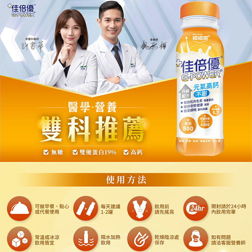 維維樂佳倍優的元氣高鈣配方。各大醫學中心指定使用,超過千位醫學人士認同,國家認證營養師調配。雙優蛋白幫助肌肉生長,高鈣500配方有助維持骨骼健康,獨特專利纖維讓您飽足順暢。四重營養機制,醫學營養雙科推薦,無糖、無乳糖、零膽固醇,低鈉、專利纖維、高鈣。奶素可食 商品名稱:維維樂 佳倍優 元氣高鈣 商品口味:元氣高鈣 商品規格:237ml/罐 適用對象:銀髮族群、病後補養、需增體力、上班族群、營養不足。 有效期限:12個月 商品產地:台灣 商品成分: ◆減甜 水、麥芽糊精、乾酪素鈣(含魅胶酸)植物油(芥花油、橄欖油·葡葡籽油)難消化性麥芽糊精(專利纖維)麥芽糖醇、綜合維生素礦物質(檸檬酸鉀、碳酸鈣、磷酸二氯鈣、氯化鈉、肌醇、抗壞血酸、鈉、氧化鎂、牛磺酸、葉酸、維生素E、焦磷酸鐵、硫酸鋅、銘酵母、吡啶甲酸、鉻、菸鹼醯胺、本多酸鈣、維生素K1、維生素A、硫酸錳、葡萄糖酸銅、維生素B12、維生素D3、硒酸鈉、生物素、維生素B1、維生素B6、碘化鉀、維生素B2)、分離黃豆蛋白(含支鏈胺基酸)、乳清蛋白、菊糖、中鏈三酸甘油酯、香料、乳化劑(脂肪酸甘油酯、磷酸氯化鉀、鹿角菜膠。 ◆不甜 水、麥芽糊精、乾酪素鈣(含魅胶酸)植物油(芥花油、橄欖油·葡葡籽油)難消化性麥芽糊精(專利纖維)麥芽糖醇、綜合維生素礦物質(檸檬酸鉀、碳酸鈣、磷酸二氯鈣、氯化鈉、肌醇、抗壞血酸、鈉、氧化鎂、牛磺酸、葉酸、維生素E、焦磷酸鐵、硫酸鋅、銘酵母、吡啶甲酸、鉻、菸鹼醯胺、本多酸鈣、維生素K1、維生素A、硫酸錳、葡萄糖酸銅、維生素B12、維生素D3、硒酸鈉、生物素、維生素B1、維生素B6、碘化鉀、維生素B2)、分離黃豆蛋白(含支鏈胺基酸)、乳清蛋白、菊糖、中鏈三酸甘油酯、香料、乳化劑(脂肪酸甘油酯、磷酸氯化鉀、鹿角菜膠。 『注意事項』 .每筆訂單超商取貨一次最多買12瓶,12瓶以上配送方式請選擇『宅配』。 💖 如有任何問題歡迎線上留言詢問。 .建議每日1-2罐,可做早餐、點心或代餐使用。 .未開封前可置於乾燥陰涼處保存。 即開即飲,亦可冰涼後使用。若需溫熱使用時,請隔水加熱,但勿煮沸。 .本品為高營養食品,久置下可能會有營養素的正常物理沉澱現象, 使用前請搖勻後使用。未食用完請加蓋冷藏並於24小時內食用完畢。 .本產品含有牛奶、大豆成分。