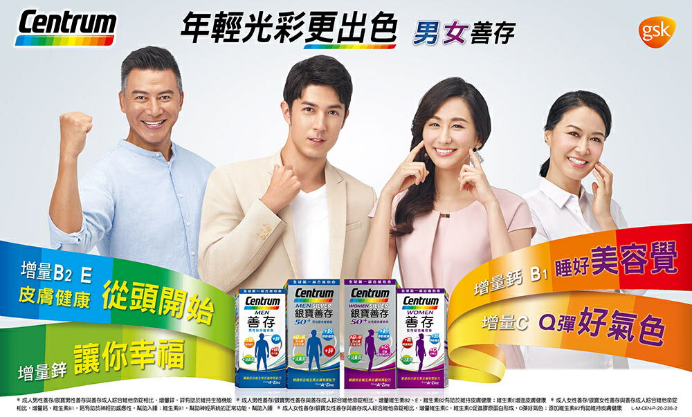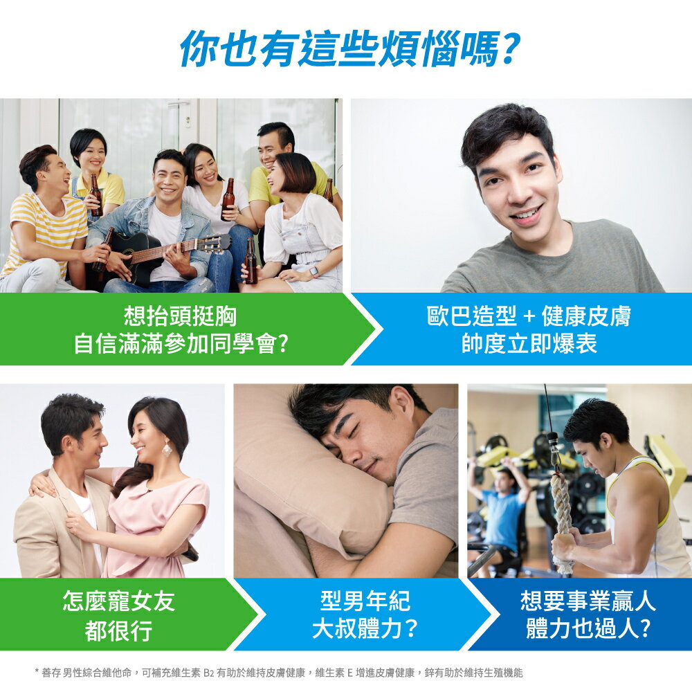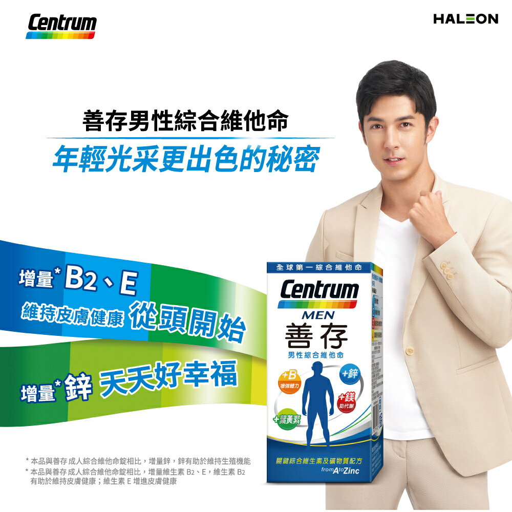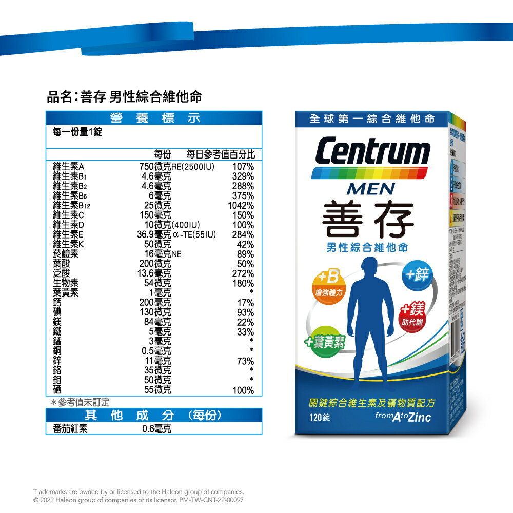 💖男性專屬配方 💖鐵助正常紅血球形成,氧氣輸送與利用,青春活力 💖鈣有助維持骨骼健康 💖維生素C促進膠原蛋白形成,具抗氧化作用 💖葉黃素源自西班牙,高品質植化素 商品名稱:善存男性綜合維他命 商品規格:120錠/盒 、65錠/盒 商品成分:碳酸鈣(碳酸鈣、麥芽糊精)、抗壞血酸(維生素C) (維生素C、羥丙基甲基纖維素)、氧化鎂、微結晶狀α-纖維素、乙酸dl-α-生育醇酯(維生素E)(維生素E、辛烯基丁二酸鈉澱粉、二氧化矽)、聚乙烯聚吡咯烷酮、磷酸氫鈣(無水)、羥丙基甲基纖維素、丁烯二酸亞鐵、菸鹼醯胺、本多酸鈣、氧化鋅、二氧化鈦、葉黃素(辛烯基丁二酸鈉澱粉、乾葡萄糖漿、蔗糖、葉黃素、L-抗壞血酸鈉(抗氧化劑)、水)、硫酸錳、鹽酸吡哆辛(維生素B6)、合成番茄紅素(蔗糖、明膠、玉米澱粉、合成番茄紅素、水、L-抗壞血酸棕櫚酸酯(抗氧化劑)、生育醇(維生素E)(抗氧化劑)、L-抗壞血酸鈉(抗氧化劑)、磷酸鈣)、滑石粉、β-胡蘿蔔素(明膠、玉米澱粉、β-胡蘿蔔素、蔗糖、水、L-抗壞血酸鈉(抗氧化劑)、磷酸鈣、混合濃縮生育醇(抗氧化劑))、硝酸硫胺明(維生素B1,硝酸噻胺)、生物素(磷酸氫鈣(無水)、生物素)、膽鈣化醇(維生素D3) (辛烯基丁二酸鈉澱粉、蔗糖、L-抗壞血酸鈉(抗氧化劑)、中鏈三酸甘油酯、二氧化矽、生育醇(維生素E)(抗氧化劑)、維生素D3)、硬脂酸鎂、核黃素(維生素B2)、二氧化矽、三氯化鉻(磷酸氫鈣(無水)、三氯化鉻)、氰鈷胺明(維生素B12) (辛烯基丁二酸鈉澱粉、檸檬酸鈉、檸檬酸、二氧化矽、維生素B12)、聚糊精、麥芽糊精、維生素A醋酸鹽(辛烯基丁二酸鈉澱粉、完全氫化棕櫚油、維生素A醋酸鹽、海藻糖、玉米澱粉)、中鏈三酸甘油酯、硫酸銅、維生素K1 (阿拉伯膠、維生素K1、蔗糖)、硒酸鈉(磷酸氫鈣(無水)、硒酸鈉)、鉬酸鈉(磷酸氫鈣(無水)、鉬酸鈉)、食用藍色二號鋁麗基、葉酸、碘化鉀。 營養標示:請參考圖片所示 商品產地:台灣 食用方法:成人每日一錠,一日請勿超過一錠,建議隨餐或飯後食用,多食無益。 保存方式:使用後請關緊瓶蓋,放置陰涼、乾燥處,避免潮濕、陽光或高溫直射。 商品劑型:錠劑 保存期限:24個月 【注意事項】 ⭐️使用後請蓋緊,並避免將水滴入瓶內。 ⭐️請置於乾燥陰涼及兒童無法取得之處。 ⭐️如同其他營養補充品,孕婦及授乳婦在食用本品前,請洽醫藥專業人員。 ⭐️若不慎食用過量,應立即停用,並諮詢醫師。 ⭐️若有食用其他補充品,請注意標示是否有含一樣的成分。 ⭐️本賣場出貨皆為新品,「物流配送過程中難免受到擠壓,」若不能接受者,歡迎到實體門市選購。 ⭐️拆封包裹時請錄影存證,如發現異常,請勿自行拆封商品包裝並直接通知我們,我們會與原廠替您做後續處理。 ⭐️所有商品不開放試用,一經開封將影響您退貨權益。 ⭐️拆封包裹若有發現異常,請即時拍照存證並通知我們。 ⭐️下標視同同意以上購物前須知。 ⭐️本品表面若有刮痕的痕迹,是由於本品並非粉劑打錠,而是由浸膏入模製成的結晶體,結晶體在拔模過程中,可能會產生類似刮痕的痕迹,此為自然現象,並非表面有受到不當磨損所引起。 ⭐️貯存時,請避免陽光直接照射或容易受潮之處 💖 如有任何問題歡迎線上留言詢問。