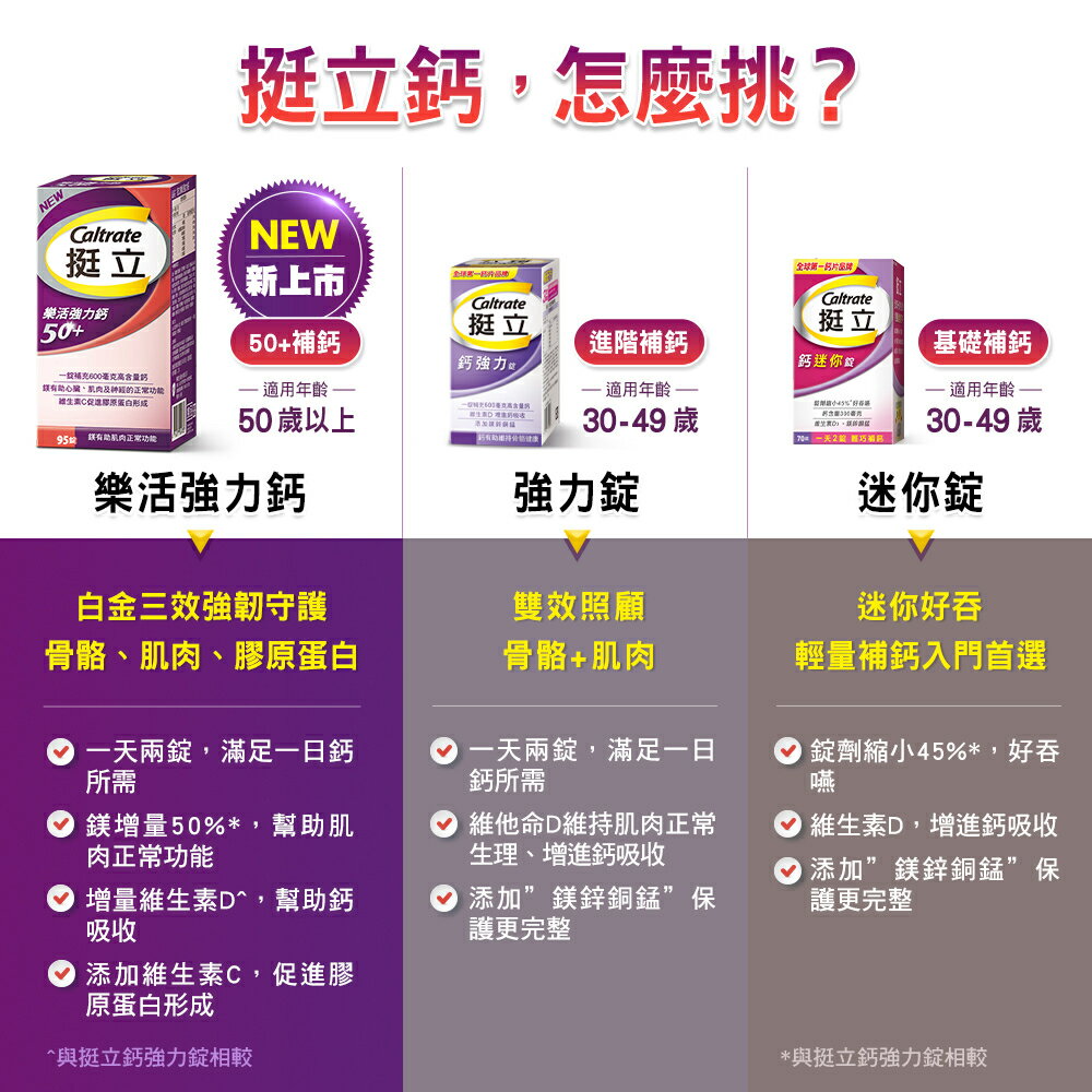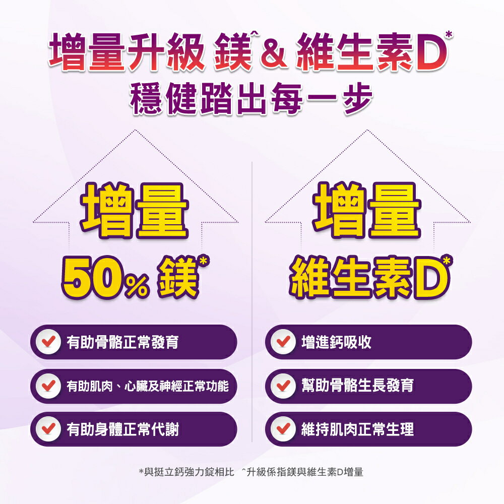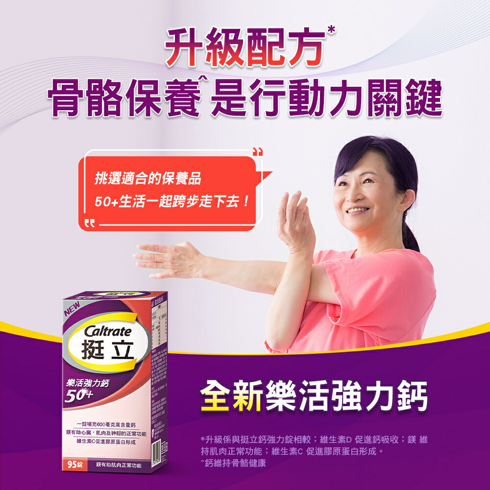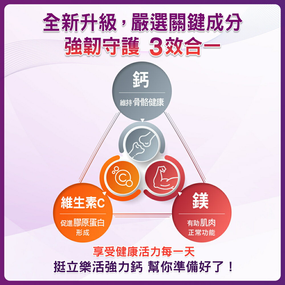 *因材積重量限制,超取請勿超過24盒,25盒以上請選擇中華郵局出貨,謝謝!! 💖 合一補鈣配方 💖 維生素C促進膠原蛋白形成 💖 1錠補充600毫克高含量鈣 商品名稱:挺立 樂活50+強力鈣錠 商品規格:95錠+40錠/盒 商品成分:碳酸鈣(碳酸鈣、麥芽糊精)、氧化鎂、微結晶狀a-纖維素、交聯羧甲基纖維素鈉、羥丙基甲基纖維素、抗壞血酸(維生素C)(維生素C、羥丙基甲基纖維素)、二氧化鈦、氧化鋅、滑石粉、硫酸錳、膽鈣化醇(維生素D3)(辛烯基丁二酸鈉澱粉、蔗糖、L-抗壞血酸鈉(維生素C)(抗氧化劑)、中鏈三酸甘油酯、二氧化矽、生育醇(維生素E)(抗氧化劑)、維生素D3)、聚糊精、麥芽糊精、中鏈三酸甘油酯、硬脂酸鎂、硫酸銅、食用紅色四十鋁麗基、食用藍色一鋁麗基。 營養標示:請參考圖片所示 商品產地:台灣 食用方法:成人每日食用2錠,飯後配水食用,一日請勿超過2錠,多食無益 保存方式:使用後請關緊瓶蓋,放置陰涼、乾燥處,避免潮濕、陽光或高溫直射。 商品劑型:錠劑 保存期限:24個月 【注意事項】 ⭐️使用後請蓋緊,並避免將水滴入瓶內。 ⭐️請置於乾燥陰涼及兒童無法取得之處。 ⭐️如同其他營養補充品,孕婦及授乳婦在食用本品前,請洽醫藥專業人員。 ⭐️若不慎食用過量,應立即停用,並諮詢醫師。 ⭐️若有食用其他補充品,請注意標示是否有含一樣的成分。 ⭐️本賣場出貨皆為新品,「物流配送過程中難免受到擠壓,」若不能接受者,歡迎到實體門市選購。 ⭐️拆封包裹時請錄影存證,如發現異常,請勿自行拆封商品包裝並直接通知我們,我們會與原廠替您做後續處理。 ⭐️所有商品不開放試用,一經開封將影響您退貨權益。 ⭐️拆封包裹若有發現異常,請即時拍照存證並通知我們。 ⭐️下標視同同意以上購物前須知。 ⭐️本品表面若有刮痕的痕迹,是由於本品並非粉劑打錠,而是由浸膏入模製成的結晶體,結晶體在拔模過程中,可能會產生類似刮痕的痕迹,此為自然現象,並非表面有受到不當磨損所引起。 ⭐️貯存時,請避免陽光直接照射或容易受潮之處 💖 如有任何問題歡迎線上留言詢問。