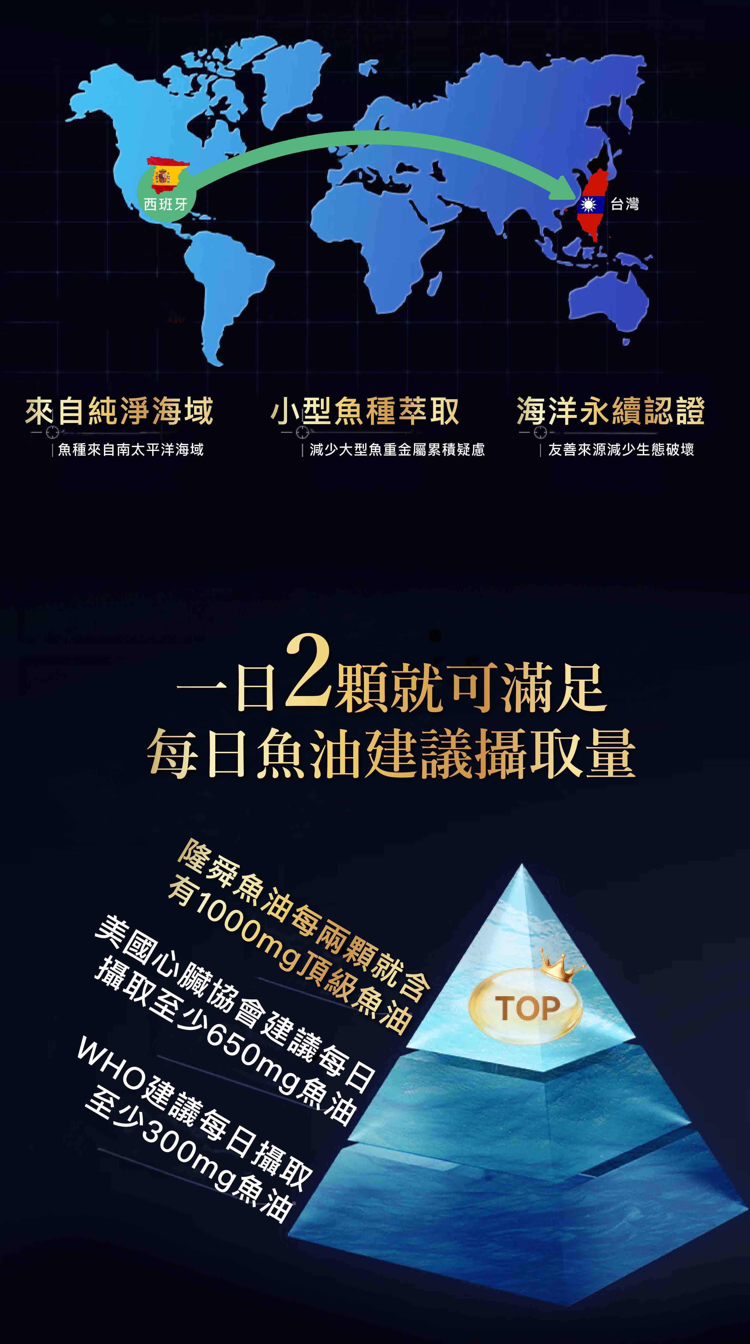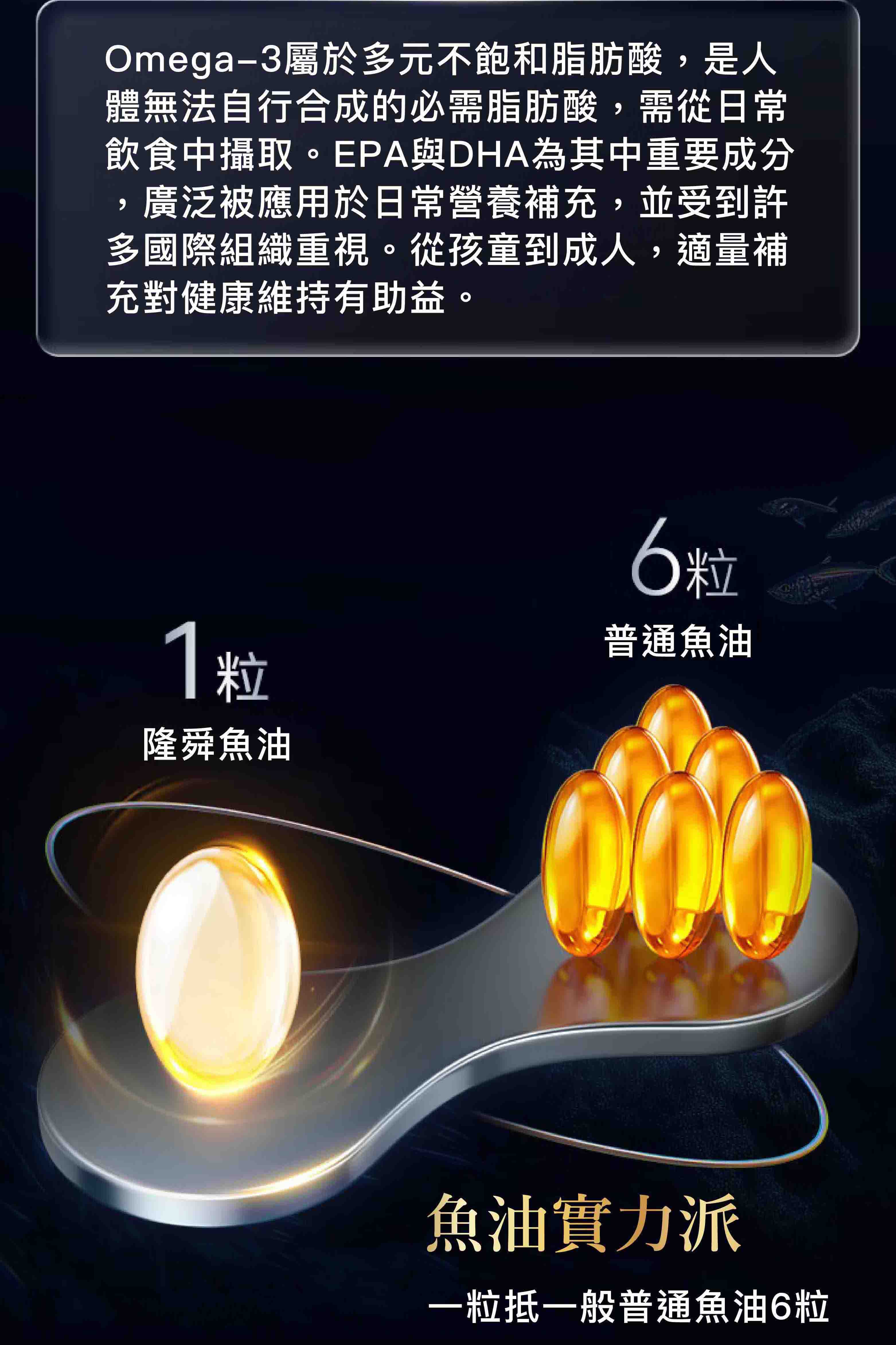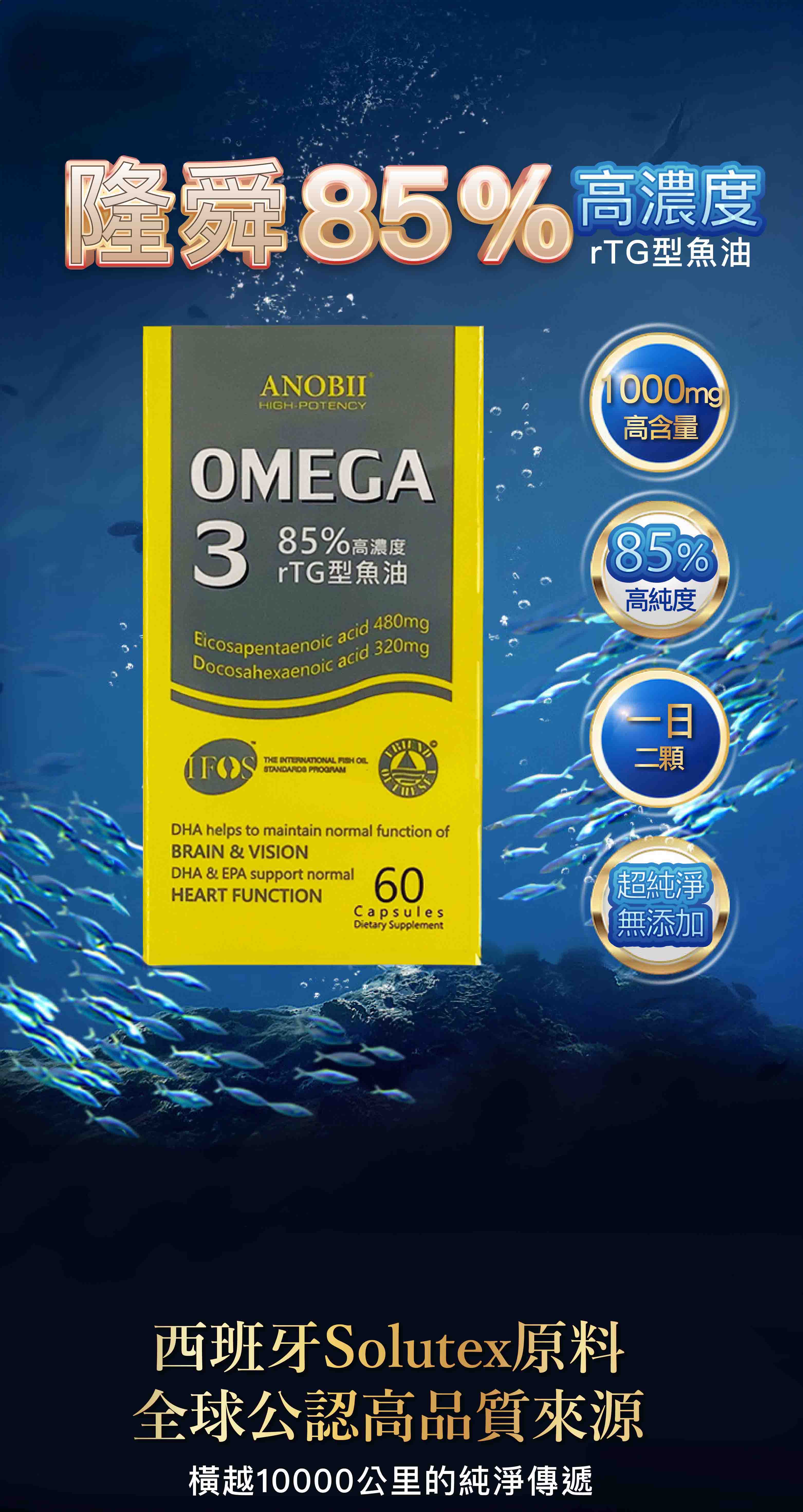 來自西班牙的頂級魚油,不僅取自純淨海域的小型魚類,無重金屬與生物累積毒 素之疑慮,內涵的多元不飽和脂肪酸 OMEGA-3 更高達 85%以上,並且採用 CO2 超臨界萃取技術,除了讓每一顆魚油不受到高溫破壞外,更貼心去除惱人的魚腥 味,絕對是銀髮保健、考生衝刺、孕期婦女的第一選擇。 🔺魚油挑選? 魚油的萃取型式: 以『rTG』吸收率最完整 魚油在萃取過程中很容易受到氧化或是其他因素的破壞,如果沒有好的萃取技術來取得魚油,就會影響到最後得到的Omega-3含量,所以挑選時也要注意萃取型式!市面上的魚油產品常見3種形式,以吸收度來比較的話,會是rTG型 > TG型 > EE型。 🔺魚油黃金比例? EPA與DHA的比例: 黃金比例3:2 許多關於魚油的國際研究論文都有提到,Omega3裡面的EPA與DHA最好的黃金比例最好在3:2,所以在挑選過程中,除了要注意Omega3的濃度外,還要注意其中關鍵的EPA與DHA的黃金比例。 🔺該選擇西班牙Solutex原料魚油嗎? 西班牙Solutex為rTG型態的魚油大廠,採用超臨界萃取方式提高魚油Omega-3的濃度。為市面上前兩大魚油原料提供者。因魚油製成複雜且技術困難,建議大家選購大廠原料來源。 商品名稱:隆舜85%高濃度魚油 rTG魚油 商品規格:60粒/盒 商品成份:魚油(含魚油Omega-3脂肪酸)、明膠、甘油、純水、混和濃縮生育純(抗氧化劑) 商品產地:台灣 食用方式:早晚各2粒,建議隨餐或飯後搭配開水服用。 『注意事項』 ★保證公司貨請安心選購。 💖 如有任何問題歡迎線上留言詢問。 ★ 建議諮詢藥師後再增加劑量,以避免藥物交互作用。 ★使用抗凝血藥物及手術開刀完的患者慎用,請先諮詢醫師或藥師。 ★若需大量下單請先私訊線上客服。 ★由於個人電腦螢幕顯示設定不同,產品顯示圖片多少會有色差,實際顏色請以收到貨品為準! ★本產品屬於私人消耗性產品,已拆封或使用過、無法恢復原狀、商品外盒損壞等情形,請恕無法辦理退換貨。 🙏🏻小幫手會盡力保護您訂購的商品,運送過程難免會有碰撞壓損外盒,敬請見諒。