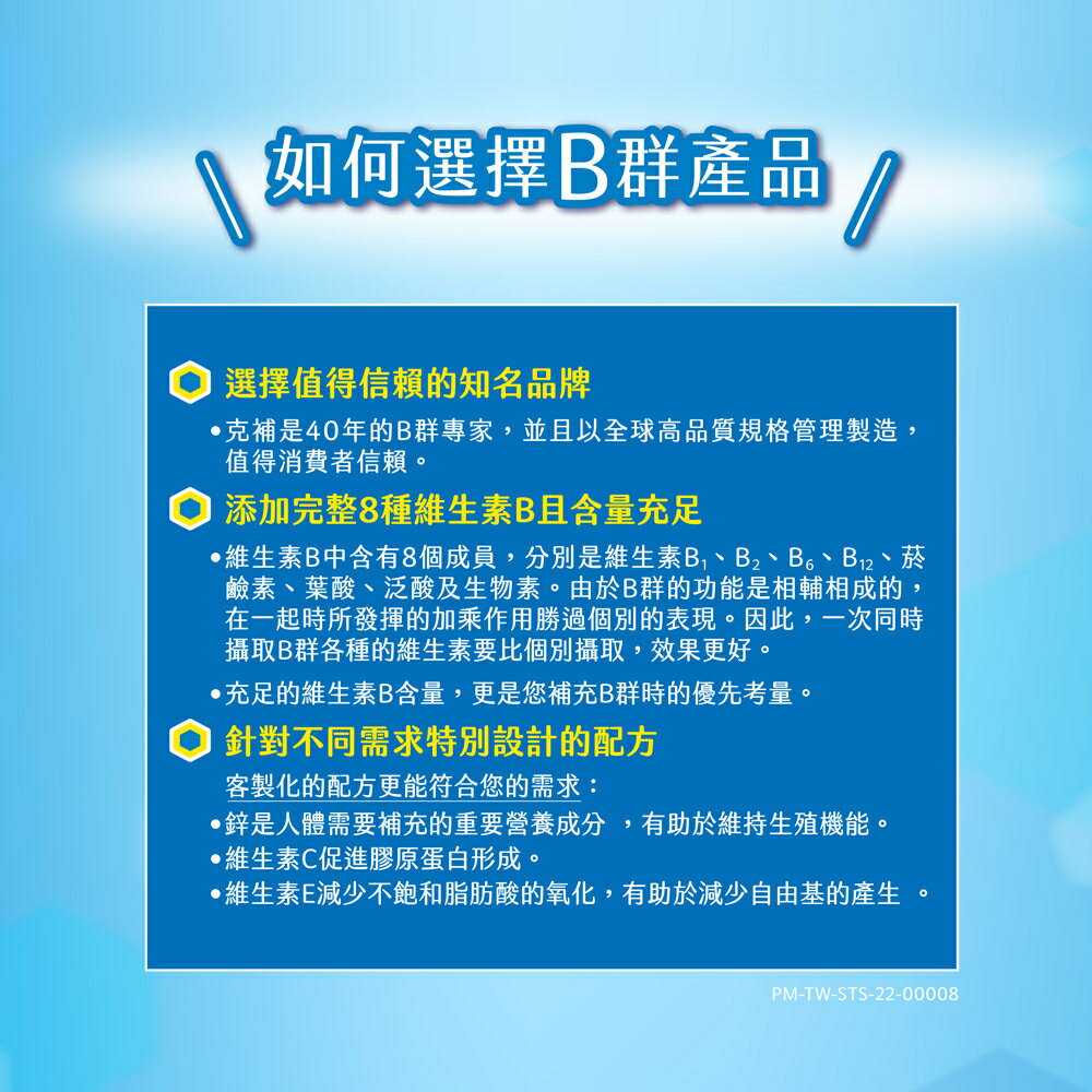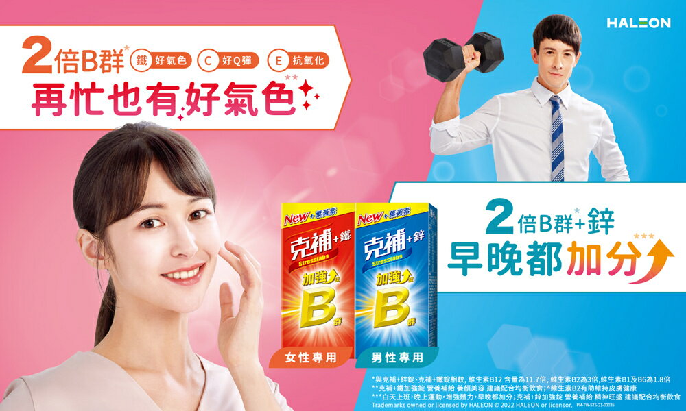 💖全新3大升級 讓你早晚都加分 💖薄荷迷你錠,清新好吞 💖完整B群,B2增量2倍 💖添加葉黃素 商品名稱:克補B群+鋅加強錠 商品規格:100錠/盒 商品成分:抗壞血酸(維生素C)97%(維生素C、羥丙基甲基纖維素)、微結晶狀纖維素、菸鹼醯胺、乙酸dl-α-生育醇酯(維生素E)50%(維生素E、辛烯基丁二酸鈉澱粉、二氧化矽)、鹽酸吡哆辛(維生素B6)33.3%(脂肪酸甘油酯、維生素B6)、硝酸硫胺明(維生素B1,硝酸噻胺)、核黃素(維生素B2)、本多酸鈣、氧化鋅、留蘭香香料16%(麥芽糊精、留蘭香油、辛烯基丁二酸鈉澱粉)、聚乙烯醇、氰鈷胺明(維生素B12)1%[辛烯基丁二酸鈉澱粉、檸檬酸鈉、檸檬酸、二氧化矽、維生素B12]、聚乙烯聚吡咯烷酮、葉黃素5%[明膠、蔗糖、玉米澱粉、水、葉黃素、磷酸鈣、生育醇(維生素E)(抗氧化劑)、L-抗壞血酸鈉(抗氧化劑)、抗壞血酸棕櫚酸酯(抗氧化劑)]、二氧化鈦、滑石粉、生物素1%[磷酸氫鈣(無水)、生物素]、二氧化矽、硬脂酸鎂、食用黃色五號鋁麗基、硫酸銅、卵磷脂、葉酸、玉米糖膠。 營養標示:請參考圖片所示 商品產地:台灣 食用方法:成人每日一錠,一日請勿超過一錠,建議隨餐或飯後食用,多食無益。 保存方式:使用後請關緊瓶蓋,放置陰涼、乾燥處,避免潮濕、陽光或高溫直射。 商品劑型:錠劑 保存期限:24個月 【注意事項】 ⭐️使用後請蓋緊,並避免將水滴入瓶內。 ⭐️請置於乾燥陰涼及兒童無法取得之處。 ⭐️如同其他營養補充品,孕婦及授乳婦在食用本品前,請洽醫藥專業人員。 ⭐️若不慎食用過量,應立即停用,並諮詢醫師。 ⭐️若有食用其他補充品,請注意標示是否有含一樣的成分。 ⭐️本賣場出貨皆為新品,「物流配送過程中難免受到擠壓,」若不能接受者,歡迎到實體門市選購。 ⭐️拆封包裹時請錄影存證,如發現異常,請勿自行拆封商品包裝並直接通知我們,我們會與原廠替您做後續處理。 ⭐️所有商品不開放試用,一經開封將影響您退貨權益。 ⭐️拆封包裹若有發現異常,請即時拍照存證並通知我們。 ⭐️下標視同同意以上購物前須知。 ⭐️本品表面若有刮痕的痕迹,是由於本品並非粉劑打錠,而是由浸膏入模製成的結晶體,結晶體在拔模過程中,可能會產生類似刮痕的痕迹,此為自然現象,並非表面有受到不當磨損所引起。 ⭐️食用時可能會有尿液變黃的現象,是因為克補含有水溶性維生素B2成分,食用一定量後,會隨尿液自然排出,此為正常現象,無須掛慮。