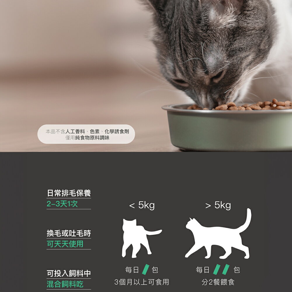 ⭐️木入森排毛粉是用科學排毛的專業排毛粉,不只單純添加各種專利纖維與酵素排毛,且是真正破解「水溶性纖維 與 非水溶纖維 黃金比例」的排毛粉。克服排毛粉需要多喝水、易卡便腹脹等缺陷,經千位見證者有感回饋,兼具美味營養與顯著速效排毛。還在吃化毛膏幫貓咪排毛嗎? 不如試試更天然、更安全健康,但同樣美味的排毛粉吧! 商品名稱:木入森 貓咪排毛粉 主要成分: ★貓草風味★ 洋車前子、菊苣纖維、小麥苗粉、n-zimes®綜合消化酵素(麥芽糊精、澱粉分解酵素、植酸酵素、葡萄糖澱粉酵素、中性蛋白質分解酵素、鳳梨酵素、蛋白質分解酵素4.5、轉化酵素、蛋白質分解酵素、半纖維素分解酵素、果膠酵素、α-半乳糖苷酶、蛋白質分解酵素AM、脂肪分解酵素、胜肽分解酵素、乳糖分解酵素、蛋白質分解酵素6、澱粉酵素、纖維素分解酵素AN)。 ★起司風味★ 洋車前子、燕麥纖維(不含麩質)、起司風味粉、n-zimes®綜合消化酵素(麥芽糊精、澱粉分解酵素、植酸酵素、葡萄糖澱粉酵素、中性蛋白質分解酵素、鳳梨酵素、蛋白質分解酵素4.5、轉化酵素、蛋白質分解酵素、半纖維素分解酵素、果膠酵素、α-半乳糖苷酶、蛋白質分解酵素AM、脂肪分解酵素、胜肽分解酵素、乳糖分解酵素、蛋白質分解酵素6、澱粉酵素、纖維素分解酵素AN)、南瓜粉。 ★鮮蝦風味★ 洋車前子、燕麥纖維(不含麩質)、鮮蝦風味粉、n-zimes®綜合消化酵素(麥芽糊精、澱粉分解酵素、植酸酵素、葡萄糖澱粉酵素、中性蛋白質分解酵素、鳳梨酵素、蛋白質分解酵素4.5、轉化酵素、蛋白質分解酵素、半纖維素分解酵素、果膠酵素、α-半乳糖苷酶、蛋白質分解酵素AM、脂肪分解酵素、胜肽分解酵素、乳糖分解酵素、蛋白質分解酵素6、澱粉酵素、纖維素分解酵素AN)、南瓜粉 商品產地:台灣 商品規格:2公克 / 包;15包 / 盒,30包 / 盒 商品貨源:原廠公司貨 保存期限:三年 『注意事項』 ⭐️本賣場出貨皆為新品,「物流配送過程中難免受到擠壓,」若不能接受者,歡迎到實體門市選購。 ⭐️「拆封包裹時請錄影存證,如發現異常,請勿自行拆封商品包裝並直接通知我們,我們會與原廠替您做後續處理。」 ⭐️所有商品不開放試用,一經開封將影響您退貨權益。 ⭐️拆封包裹若有發現異常,請即時拍照存證並通知我們。 ⭐️下標視同同意以上購物前須知。