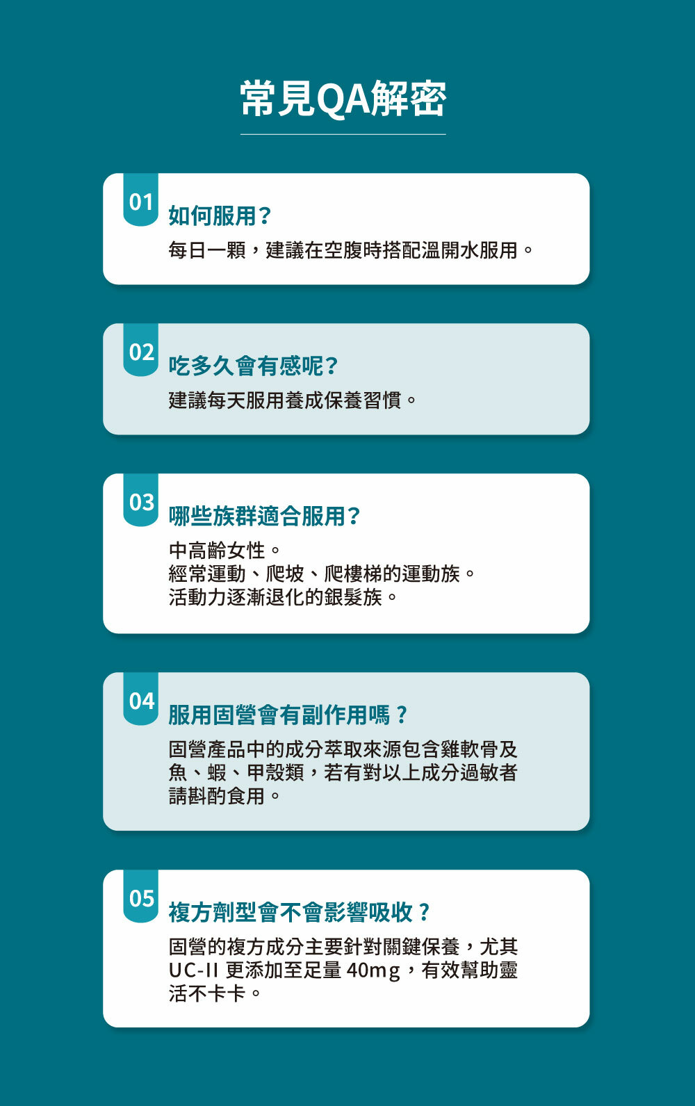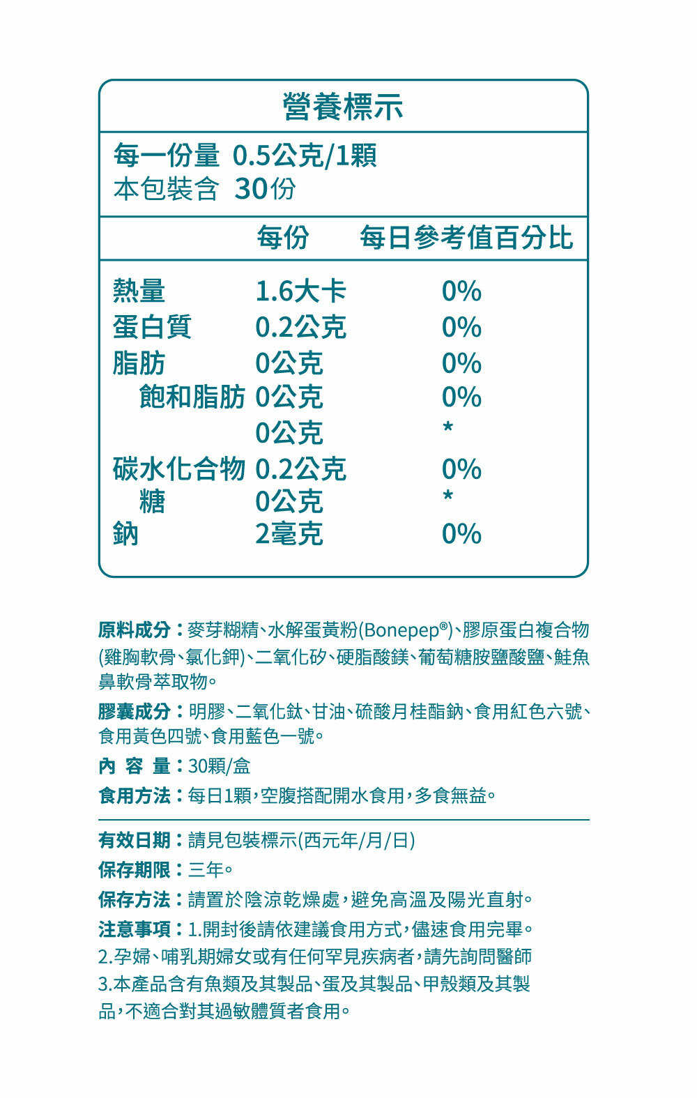 商品名稱:中化健康360 固營非變性第二型膠原蛋白 商品規格:30顆/盒。500毫克/顆 商品成分:麥芽糊精、水解蛋黃粉(Bonepep)、膠原蛋白複合物(雞胸軟骨、氯化鉀)、二氧化矽、硬脂酸鎂、葡萄糖胺鹽酸鹽、鮭魚鼻軟骨萃取物 營養標示:如圖所示 食用方式:每日一顆,多食無益。 商品產地:台灣 保存期限:三年 『注意事項』 ⭐️本賣場出貨皆為新品,「物流配送過程中難免受到擠壓,」若不能接受者,歡迎到實體門市選購。 ⭐️拆封包裹時請錄影存證,如發現異常,請勿自行拆封商品包裝並直接通知我們,我們會與原廠替您做後續處理。 ⭐️所有商品不開放試用,一經開封將影響您退貨權益。 ⭐️拆封包裹若有發現異常,請即時拍照存證並通知我們。 ⭐️下標視同同意以上購物前須知。 ⭐️貯存時,請避免陽光直接照射或容易受潮之處 💖 如有任何問題歡迎線上留言詢問。