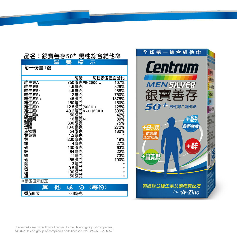 💖 男性銀寶善存,打造50+男性專屬配方 💖 鈣有助維持骨骼健康 / B1及鎂有助心臟正常功能 💖 B6及B12增進神經系統健康 💖 鋅有助維持生殖機能 💖 8種B增強體力 💖 葉黃素源自西班牙,高品質植化素 商品名稱:銀寶善存50+男性綜合維他命 商品規格:120錠/盒 、65錠/盒 商品成分:碳酸鈣(碳酸鈣、麥芽糊精)、抗壞血酸(維生素C) (維生素C、羥丙基甲基纖維素)、氧化鎂、微結晶狀α-纖維素、乙酸dl-α-生育醇酯(維生素E) (維生素E、辛烯基丁二酸鈉澱粉、二氧化矽)、聚乙烯聚吡咯烷酮、磷酸氫鈣(無水)、羥丙基甲基纖維素、菸鹼醯胺、本多酸鈣、鹽酸吡哆辛(維生素B6)、葉黃素(辛烯基丁二酸鈉澱粉、乾葡萄糖漿、蔗糖、葉黃素、L-抗壞血酸鈉(抗氧化劑)、水)、氧化鋅、丁烯二酸亞鐵、二氧化鈦、三氯化鉻(磷酸氫鈣(無水)、三氯化鉻)、硫酸錳、合成番茄紅素(明膠、蔗糖、玉米澱粉、合成番茄紅素、水、L-抗壞血酸棕櫚酸酯(抗氧化劑)、生育醇(維生素E)(抗氧化劑)、L-抗壞血酸鈉(抗氧化劑)、磷酸鈣)、滑石粉、膽鈣化醇(維生素D3)(辛烯基丁二酸鈉澱粉、蔗糖、L-抗壞血酸鈉(抗氧化劑)、中鏈三酸甘油酯、二氧化矽、生育醇(維生素E)(抗氧化劑)、維生素D3)、β-胡蘿蔔素(明膠、玉米澱粉、β-胡蘿蔔素、蔗糖、水、L-抗壞血酸鈉(抗氧化劑)、磷酸鈣、混合濃縮生育醇(抗氧化劑))、硝酸硫胺明(維生素B1,硝酸噻胺)、生物素(磷酸氫鈣(無水)、生物素)、氰鈷胺明(維生素B12)(辛烯基丁二酸鈉澱粉、檸檬酸鈉、檸檬酸、二氧化矽、維生素B12)、硬脂酸鎂、核黃素(維生素B2)、二氧化矽、聚糊精、麥芽糊精、維生素A醋酸鹽(辛烯基丁二酸鈉澱粉、完全氫化棕櫚油、維生素A醋酸鹽、海藻糖、玉米澱粉)、中鏈三酸甘油酯、硫酸銅、維生素K1 (阿拉伯膠、維生素K1、蔗糖)、硒酸鈉(磷酸氫鈣(無水)、硒酸鈉)、鉬酸鈉(磷酸氫鈣(無水)、鉬酸鈉)、食用藍色二號鋁麗基、葉酸、碘化鉀。 營養標示:請參考圖片所示 商品產地:台灣 食用方法:成人每日一錠,一日請勿超過一錠,建議隨餐或飯後食用,多食無益。 保存方式:使用後請關緊瓶蓋,放置陰涼、乾燥處,避免潮濕、陽光或高溫直射。 商品劑型:錠劑 保存期限:24個月 【注意事項】 ⭐️使用後請蓋緊,並避免將水滴入瓶內。 ⭐️請置於乾燥陰涼及兒童無法取得之處。 ⭐️如同其他營養補充品,孕婦及授乳婦在食用本品前,請洽醫藥專業人員。 ⭐️若不慎食用過量,應立即停用,並諮詢醫師。 ⭐️若有食用其他補充品,請注意標示是否有含一樣的成分。 ⭐️本賣場出貨皆為新品,「物流配送過程中難免受到擠壓,」若不能接受者,歡迎到實體門市選購。 ⭐️拆封包裹時請錄影存證,如發現異常,請勿自行拆封商品包裝並直接通知我們,我們會與原廠替您做後續處理。 ⭐️所有商品不開放試用,一經開封將影響您退貨權益。 ⭐️拆封包裹若有發現異常,請即時拍照存證並通知我們。 ⭐️下標視同同意以上購物前須知。 ⭐️本品表面若有刮痕的痕迹,是由於本品並非粉劑打錠,而是由浸膏入模製成的結晶體,結晶體在拔模過程中,可能會產生類似刮痕的痕迹,此為自然現象,並非表面有受到不當磨損所引起。 ⭐️貯存時,請避免陽光直接照射或容易受潮之處 💖 如有任何問題歡迎線上留言詢問。