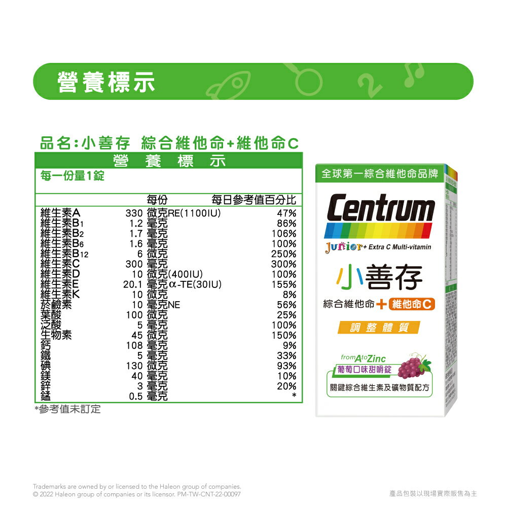💖專為4-16歲兒童設計 💖提供完整均衡營養 兒童健康成長 💖含維生素D及鈣,幫助骨骼及牙齒 商品名稱:小善存+鈣 綜合維他命 商品規格:橘子口味甜嚼錠 60錠/盒 、葡萄口味甜嚼錠 60錠/盒 商品成分:蔗糖(蔗糖、麥芽糊精)、磷酸氫鈣(無水)、碳酸鈣(碳酸鈣、麥芽糊精)、抗壞血酸(維生素C)、氧化鎂、乙酸dl-α-生育醇酯(維生素E)(維生素E、辛烯基丁二酸鈉澱粉、二氧化矽)、微結晶狀α-纖維素、菸鹼醯胺(脂肪酸甘油酯、菸鹼醯胺、二氧化矽)、丁烯二酸亞鐵(丁烯二酸亞鐵、棕櫚油)、複方色料(喹啉黃鋁麗基、食用紅色七號鋁麗基)、甜味香料(葡萄糖、香料)、無水檸檬酸、橘子香料(阿拉伯膠、橘子油、香料、三乙酸甘油酯、丁基羥基甲氧苯(抗氧化劑))、阿斯巴甜(甜味劑)、硬脂酸鎂、鹽酸吡哆辛(維生素B6)(脂肪酸甘油酯、維生素B6)、本多酸鈣、核黃素(維生素B2)(脂肪酸甘油酯、維生素B2、玉米澱粉)、膽鈣化醇(維生素D3) (辛烯基丁二酸鈉澱粉、蔗糖、L-抗壞血酸鈉(抗氧化劑)、中鏈三酸甘油酯、二氧化矽、生育醇(維生素E)(抗氧化劑)、維生素D3)、硝酸硫胺明(維生素B1,硝酸噻胺) (脂肪酸甘油酯、維生素B1)、生物素(磷酸氫鈣(無水)、生物素)、氧化鋅、二氧化矽、β-胡蘿蔔素(明膠、玉米澱粉、β-胡蘿蔔素、蔗糖、水、L-抗壞血酸鈉(抗氧化劑)、磷酸鈣、混合濃縮生育醇(抗氧化劑))、硫酸錳、維生素A醋酸鹽(辛烯基丁二酸鈉澱粉、完全氫化棕櫚油、維生素A醋酸鹽、海藻糖、玉米澱粉)、氰鈷胺明(維生素B12) (辛烯基丁二酸鈉澱粉、檸檬酸鈉、檸檬酸、二氧化矽、維生素B12)、維生素K1 (阿拉伯膠、維生素K1、蔗糖)、碘化鉀、葉酸。 營養標示:請參考圖片所示 商品產地:台灣 食用方法:成人每日一錠,一日請勿超過一錠,建議隨餐或飯後食用,多食無益。 保存方式:使用後請關緊瓶蓋,放置陰涼、乾燥處,避免潮濕、陽光或高溫直射。 商品劑型:錠劑 保存期限:24個月 【注意事項】 ⭐️使用後請蓋緊,並避免將水滴入瓶內。 ⭐️請置於乾燥陰涼及兒童無法取得之處。 ⭐️如同其他營養補充品,孕婦及授乳婦在食用本品前,請洽醫藥專業人員。 ⭐️若不慎食用過量,應立即停用,並諮詢醫師。 ⭐️若有食用其他補充品,請注意標示是否有含一樣的成分。 ⭐️本賣場出貨皆為新品,「物流配送過程中難免受到擠壓,」若不能接受者,歡迎到實體門市選購。 ⭐️拆封包裹時請錄影存證,如發現異常,請勿自行拆封商品包裝並直接通知我們,我們會與原廠替您做後續處理。 ⭐️所有商品不開放試用,一經開封將影響您退貨權益。 ⭐️拆封包裹若有發現異常,請即時拍照存證並通知我們。 ⭐️下標視同同意以上購物前須知。 ⭐️本品表面若有刮痕的痕迹,是由於本品並非粉劑打錠,而是由浸膏入模製成的結晶體,結晶體在拔模過程中,可能會產生類似刮痕的痕迹,此為自然現象,並非表面有受到不當磨損所引起。 ⭐️貯存時,請避免陽光直接照射或容易受潮之處 💖 如有任何問題歡迎線上留言詢問。