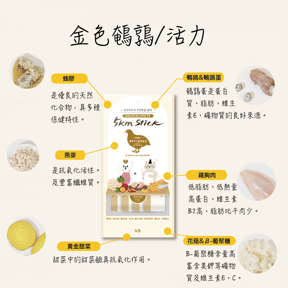 ●金色鵪鶉(活力):雞胸肉(非抗生素)、鵪鶉(肉、蛋)、純水、木薯粉、花菇、β-葡聚糖、燕麥片、金甜菜、蜂膠。