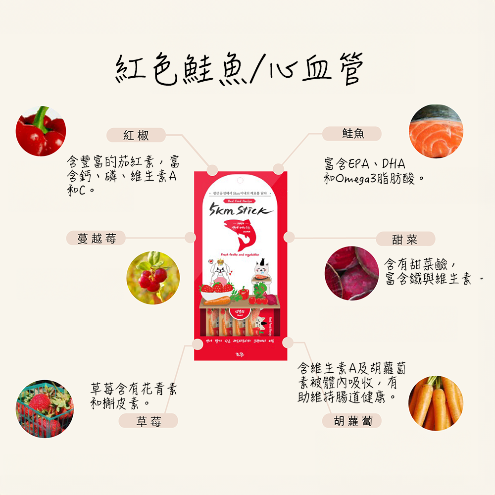 ●紅色鮭魚(心血管) :鮭魚、草莓、蔓越莓、胡蘿蔔、甜菜、紅甜椒粉、木薯、水與天然色素。