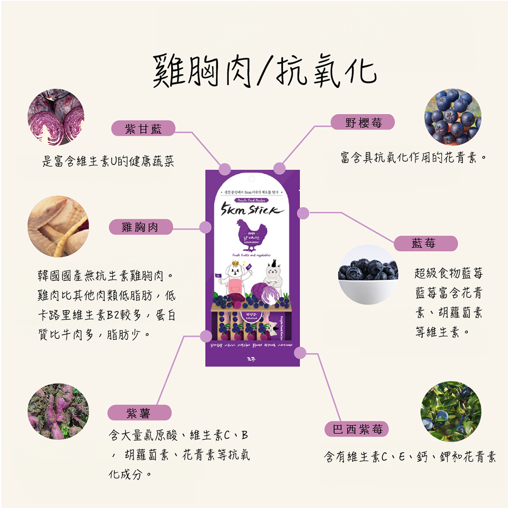 ●紫色 雞胸肉(抗氧化) :雞胸肉(非抗生素)、木薯、野櫻莓、水、紫薯、藍莓、紫甘藍、巴西紫莓。。