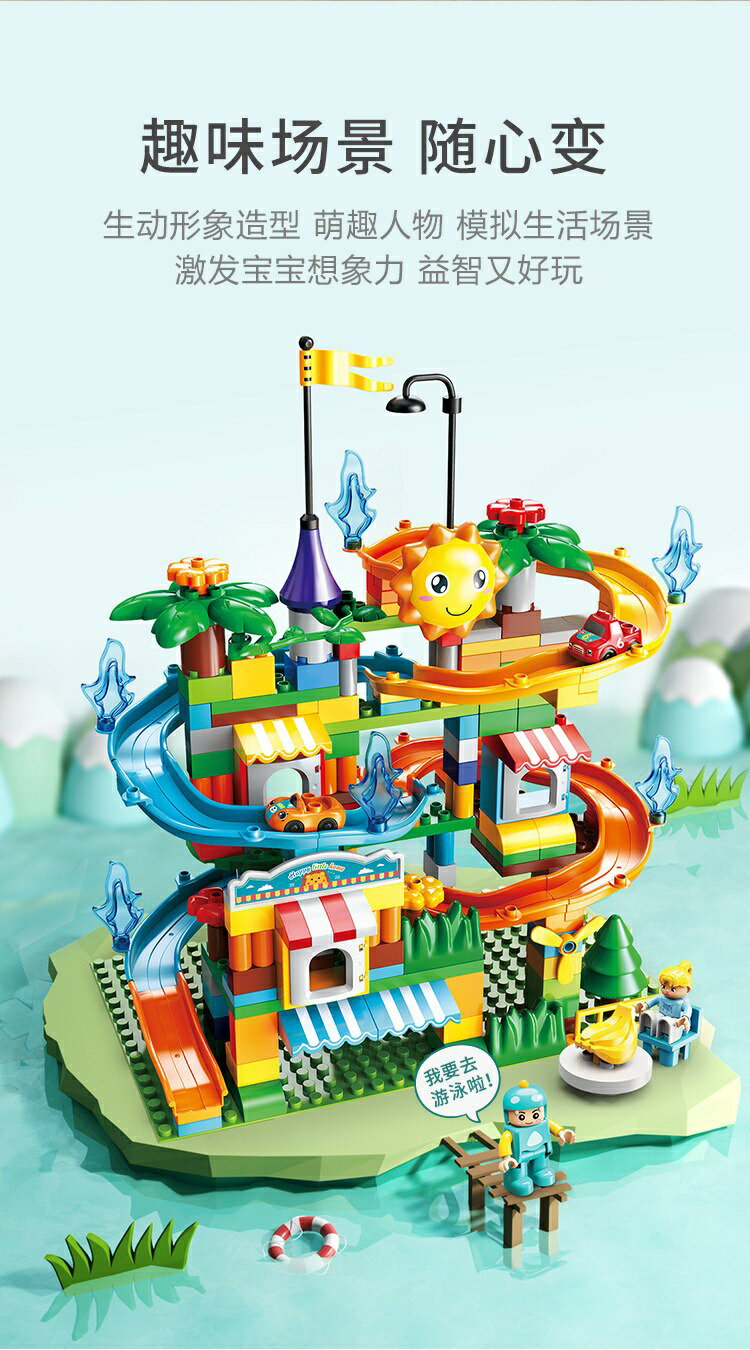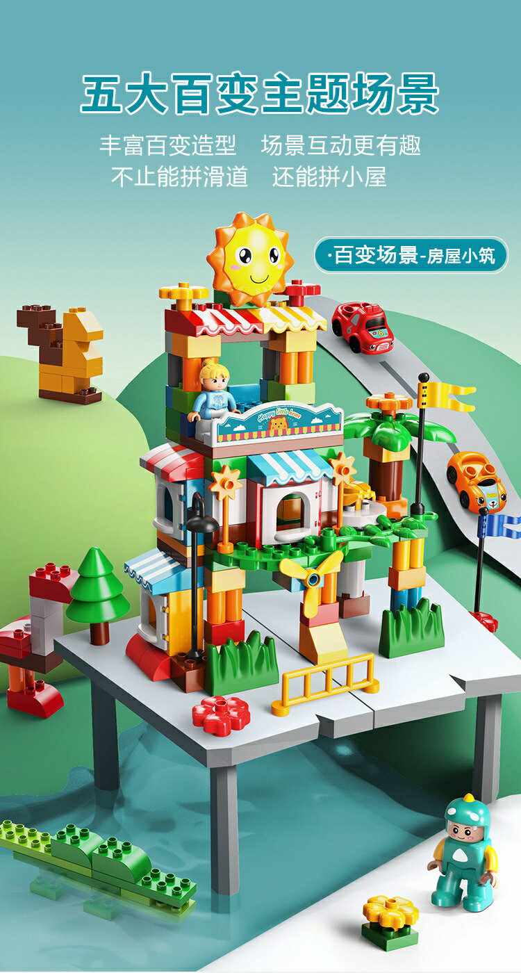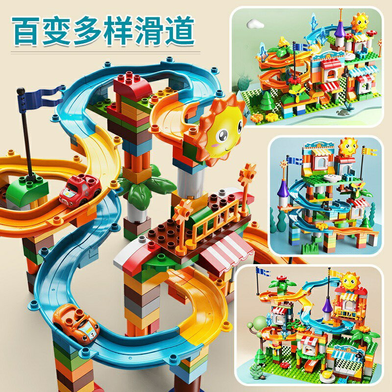 5. 男童女童  211顆粒飛車滑道樂園 小車滑道 滑道積木 -送512孔大底板 大顆粒積木 相容樂高duplo