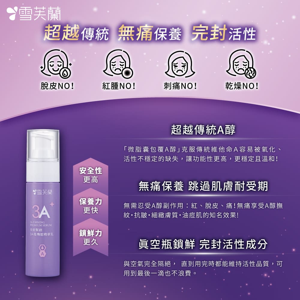 超級A醇,能改善痘肌、淡化皺紋、調理毛孔,超優秀的撫紋抗皺力,使肌膚表面更緊實光滑。