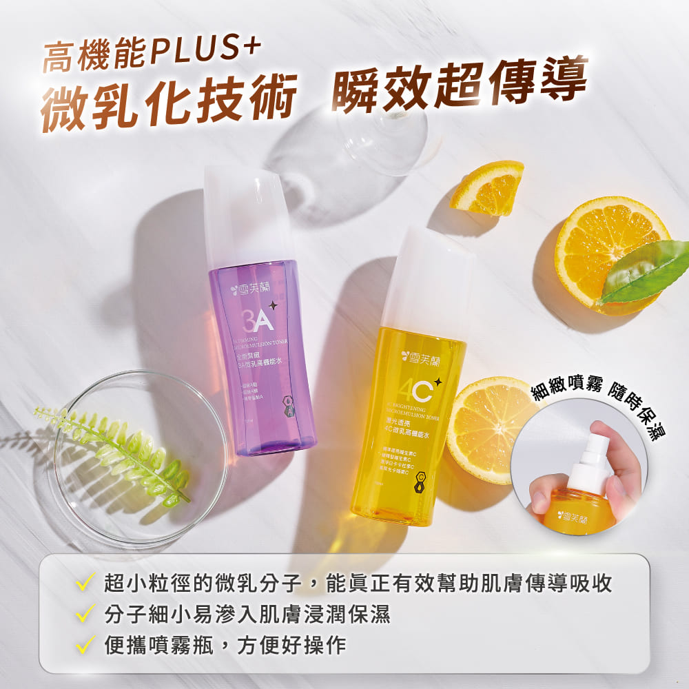 超小粒徑的微乳分子,能真正有效幫助肌膚傳導吸收,分子細小易滲入肌膚浸潤保濕,並減緩肌膚水分流失,持續性提供浸透感與滋潤度,使膚觸更柔滑細緻。