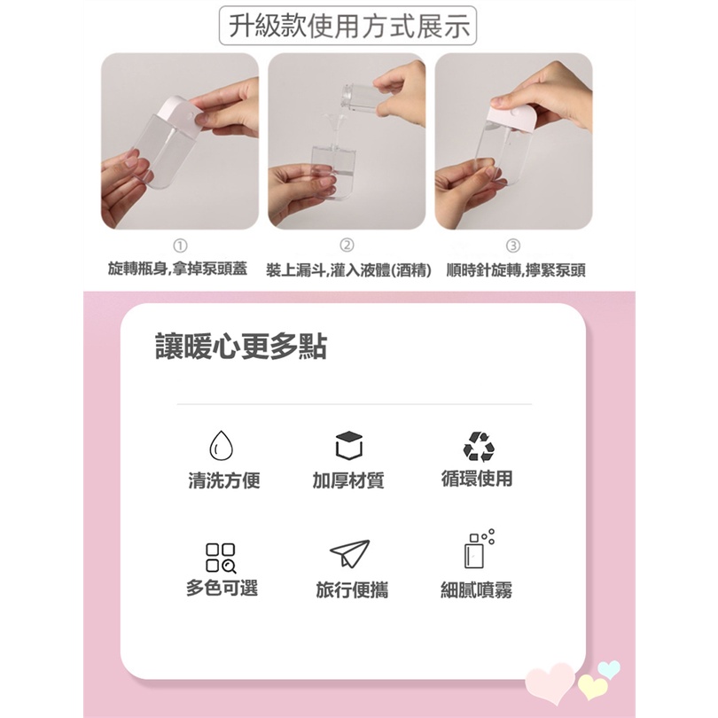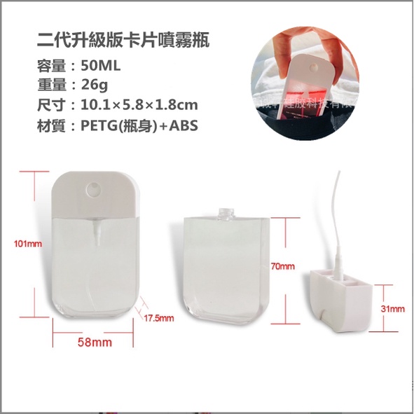 材質: PETG、ABS、矽膠。 顏色: 粉色。灰色。白色。黑色。黃色。紅色。紫色。玫紅色。藍色 尺寸: 10.3X6.1X2cm。 噴瓶容量: 50ML。 開瓶方式: 旋轉。