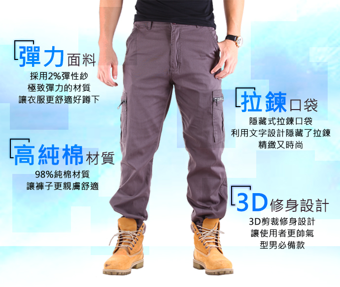潮流修身工作褲 拉鍊式大側袋 高彈力 透氣 兩色【CS衣舖】#9120
