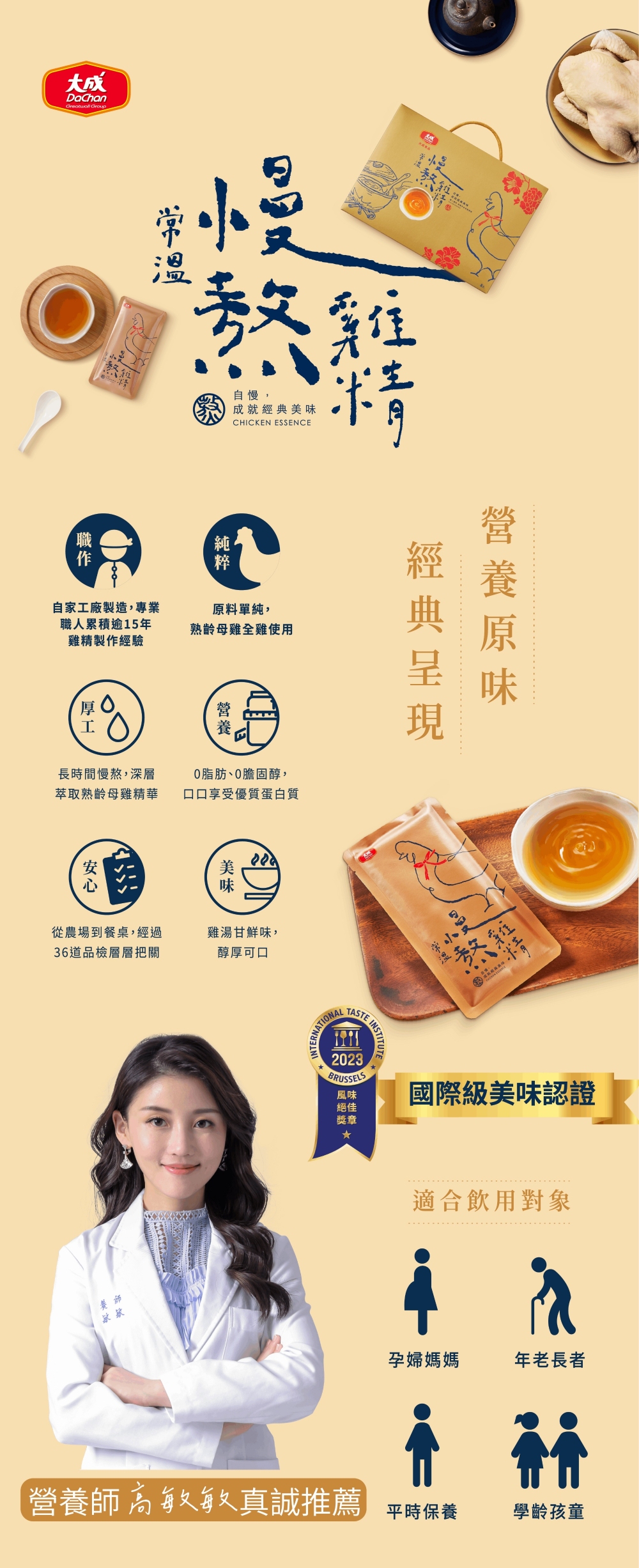 此為常溫賣場,下單前請您留意! 大成食品常溫商品請恕不與冷凍商品同時結帳出貨,如有不同溫層商品敬請分開結帳,謝謝! 大成︱雞精︱慢熬雞精(常溫)(50mL/8包/盒)買一送一、共16包(兩盒) ◆口感如雞湯甘鮮味,醇厚可口 ◆零脂肪、零膽固醇,口口享受優質蛋白質 ◆常溫款方便隨身攜帶,送禮自用都便利 使用方式: A. 隔水加熱:將整包放入水中加熱約3分鐘。 B. 電鍋加熱:剪開鋁箔袋,放入可加熱的容器內,外鍋加水約一碗,蒸5-10分鐘可飲用