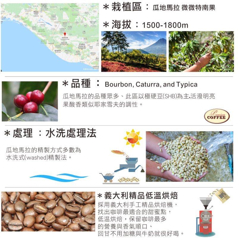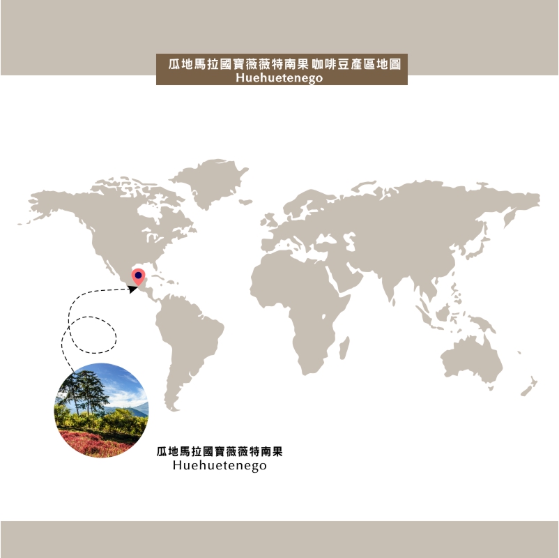聞名於世的微微特南果產區,是瓜地馬拉咖啡產區中的最耀眼的一支。富饒肥沃的火山土壤,高海拔的山嶺,蔭涼潮濕的森林,充足的陽光是微微特南果產區的特色。果香風味明顯,香氣及層次感豐富,甜感佳。