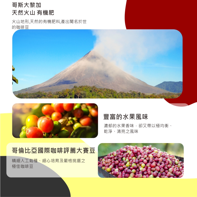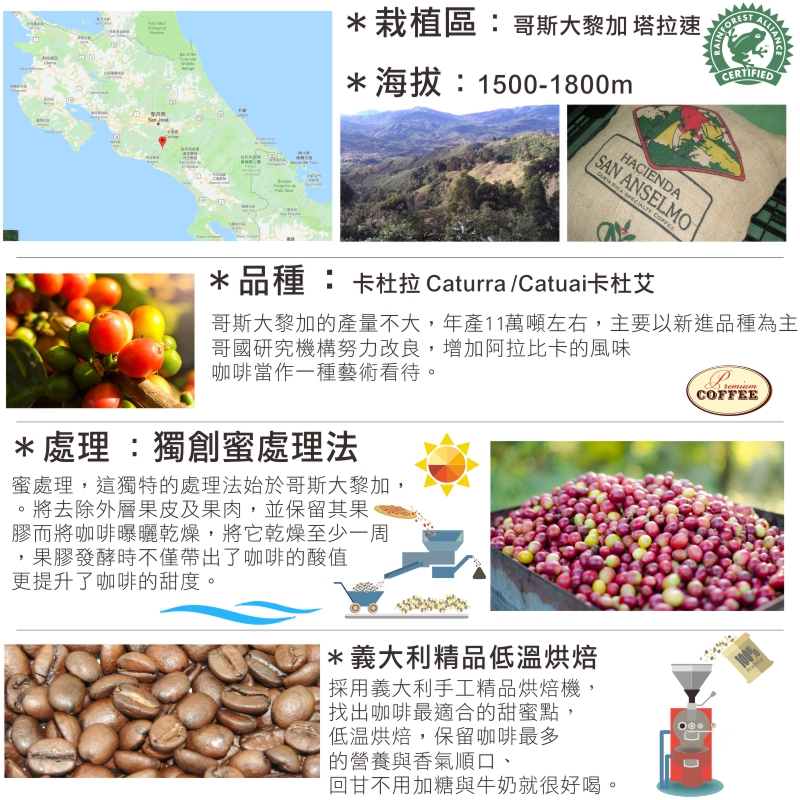 精品咖啡協會大力推廣的豆子,榮獲哥國國際咖啡評薦大賽豆!哥斯大黎加為中美洲最優秀之咖啡生產國之一。濃郁的水果香味,卻又帶以極均衡、乾淨、清亮之風味。經過嚴密烘焙方式之咖啡豆,可擁有精緻咖啡之名啜吸的味道,主要是稍刺激的Tarrazu特色野草香味,厚實度佳,複雜風味佳。口感柔滑、平衡的味道。