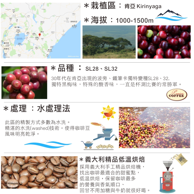 肯亞AA種植區位於富饒肥沃的紅土高山,均衡雨水土壤,高海拔的山嶺,潔淨天然的水源,蔭涼潮濕的森林,充足的陽光和向晚的涼爽微風是其的特色。帶有濃郁葡萄酒香,厚實度及回甘度特佳,芬芳花香及香醇、甘甜、圓潤的口感,是國際評鑑專家讚不絕口的咖啡。