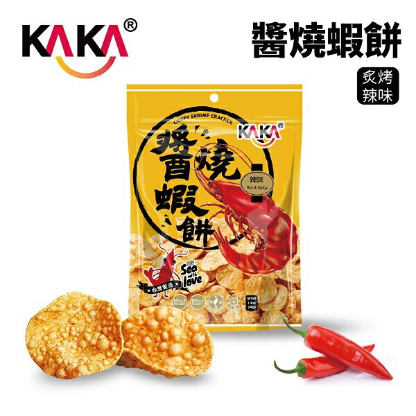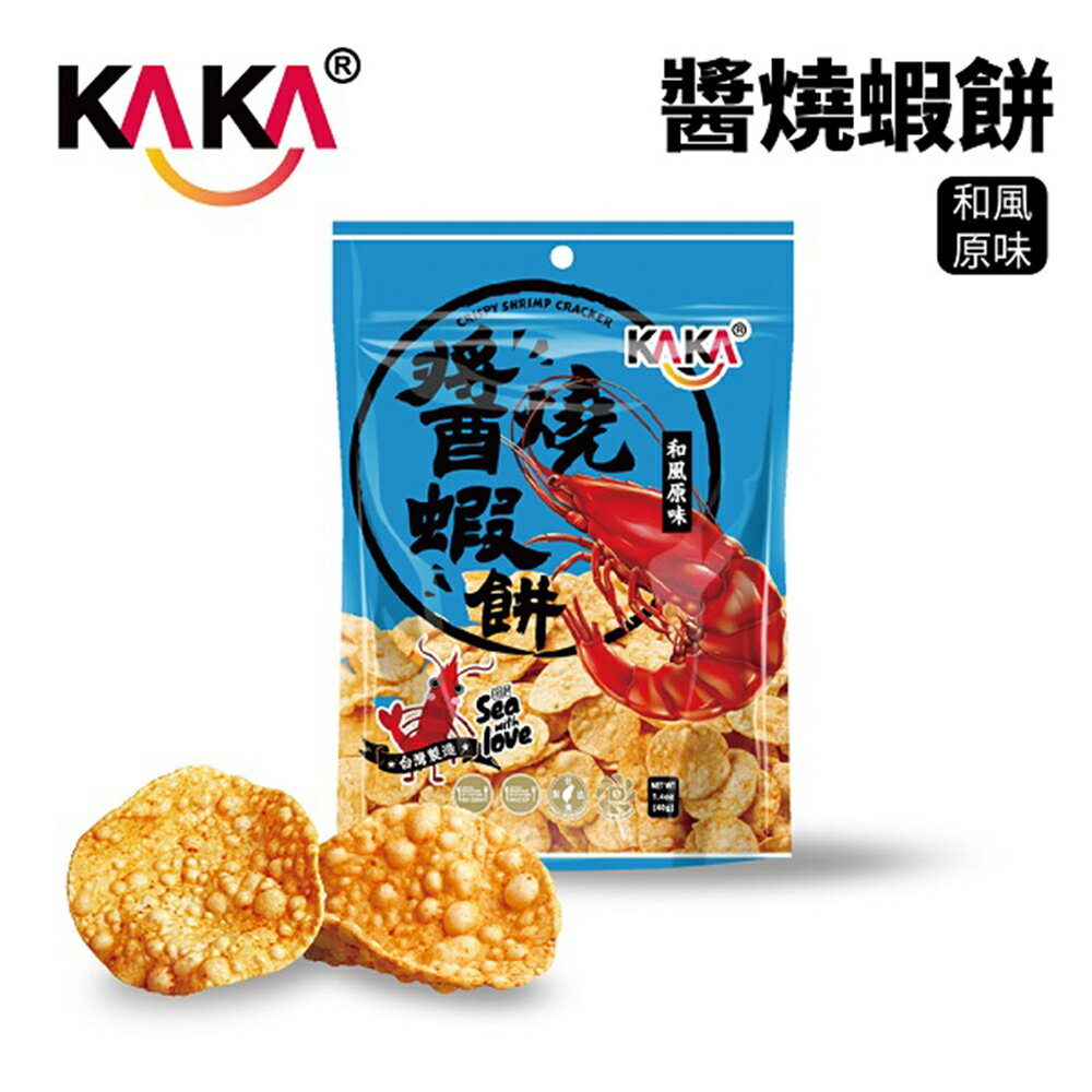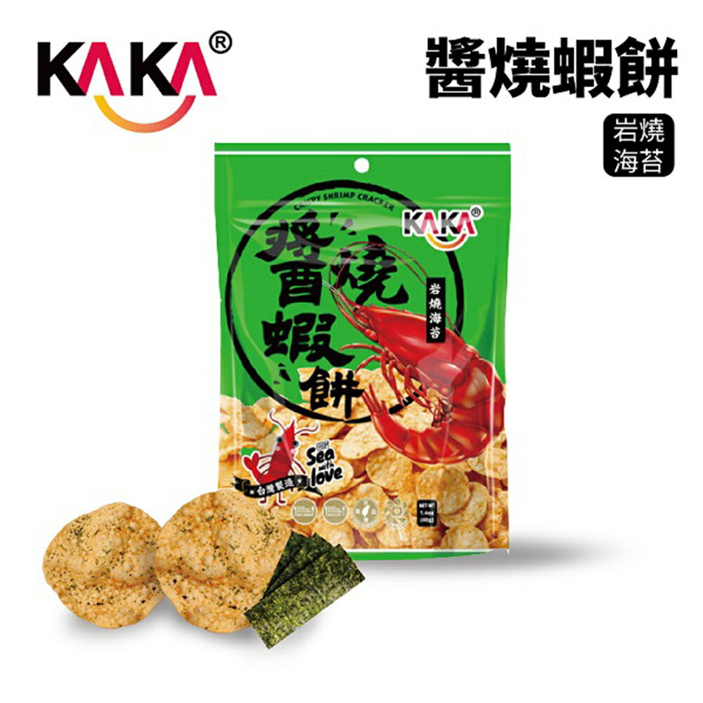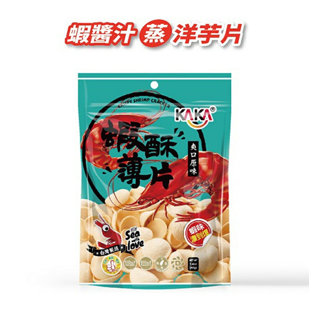 -海鮮醬汁烤洋芋片-獨門醬汁,風味絕佳-手工醬烤,口感酥脆-離心脫油,清爽不膩- 濃厚日式海苔風味,清爽涮嘴- 獨特醬烤技術,濃厚醬燒風味【產品特色】KAKA醬燒蝦餅特殊的泡泡餅皮,搭配濃濃的手工蝦醬,再運用獨特火烤技術,將美味牢牢鎖在餅皮中,讓您每一口都能吃到蝦肉般的鮮美滋味! 嚴選海鮮食材,KAKA在挑選食材上一向秉持著最好及最嚴格的態度,讓饕客食在安心。KAKA三大特色「獨門醬汁、手工醬烤、離心脫油」,讓餅乾風味更佳!KAKA獨有食品級「Deoil離心脫油」技術更讓餅乾乾燥、清爽,包裝內袋無多餘油脂殘留,讓您放心享用零食!【成份】-『和風原味 醬燒蝦餅 40g』木薯粉、馬鈴薯粉、蝦、砂糖、食鹽、棕櫚油、大蒜、維他命E(抗氧化劑)、食用色素黃色5號-『岩燒海苔 醬燒蝦餅 40g』木薯粉、馬鈴薯粉、蝦、砂糖、食鹽、棕櫚油、大蒜、海苔粉、維他命E(抗氧化劑)、食用色素黃色5號『KAKA海洋燒蝦酥薄片40g-爽口原味』木薯粉、蝦、砂糖、雞蛋、食鹽、奶粉、棕櫚油、味精(L-麩酸鈉)、大蒜、維他命E(抗氧化劑)『KAKA海洋燒蝦酥薄片40g醬燒蝦餅-炙烤辣味』木薯粉、馬鈴薯粉、蝦、砂糖、食鹽、棕櫚油、大蒜、辣椒粉、維他命E(抗氧化劑)、食用色素黃色5號。【淨重】40公克【有效日期】標於包裝上【原產地】台灣【保存期限】一年【保存方法】請置於陰涼處,避免陽光照射,開封後請及早食用完畢。【注意事項】•過敏原:本產品內含牛奶、蛋、甲殼類海鮮(蝦)、魚、魷成份,對此過敏者請避免食用。•本產品如出現小黑點乃高溫烘焙中,細糖被燻黑之現象,請安心使用。•本產品已投保國泰世紀產物保險(股)2,000萬元產品責任險(限台灣)(投保金額非理賠金額)和風原味 醬燒蝦餅 40g(藍包裝)岩燒海苔 醬燒蝦餅 40g(綠包裝)KAKA海洋燒蝦酥薄片40g-爽口原味KAKA海洋燒魷魚香圈40g原味(粉色)辣味 醬燒蝦餅 40g(黃包裝)