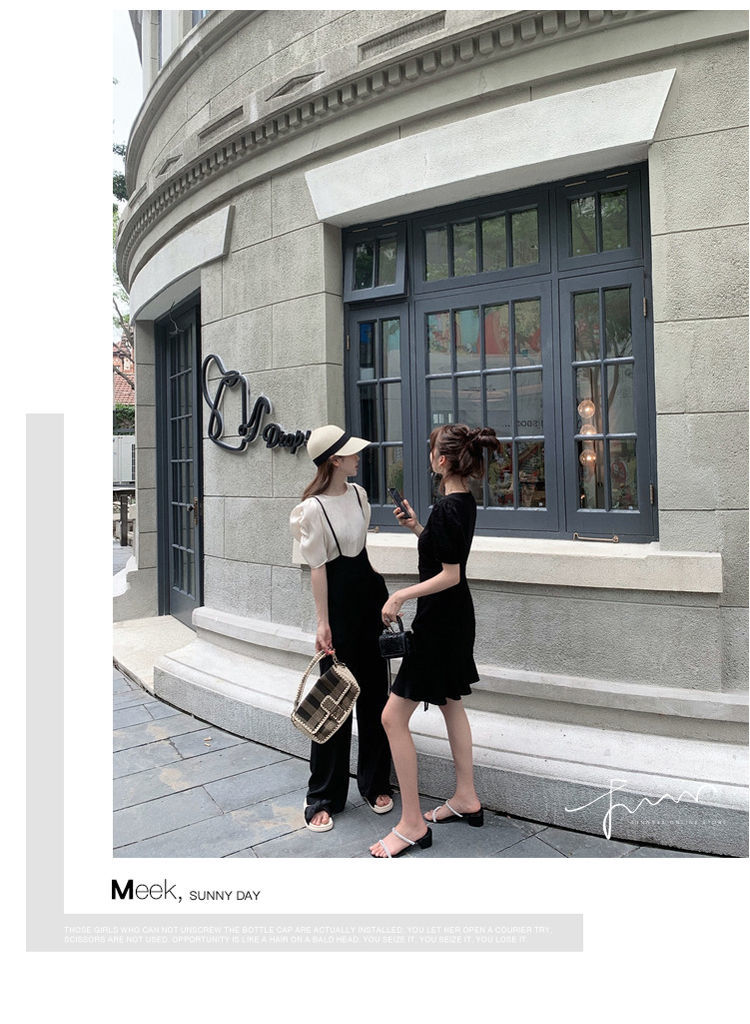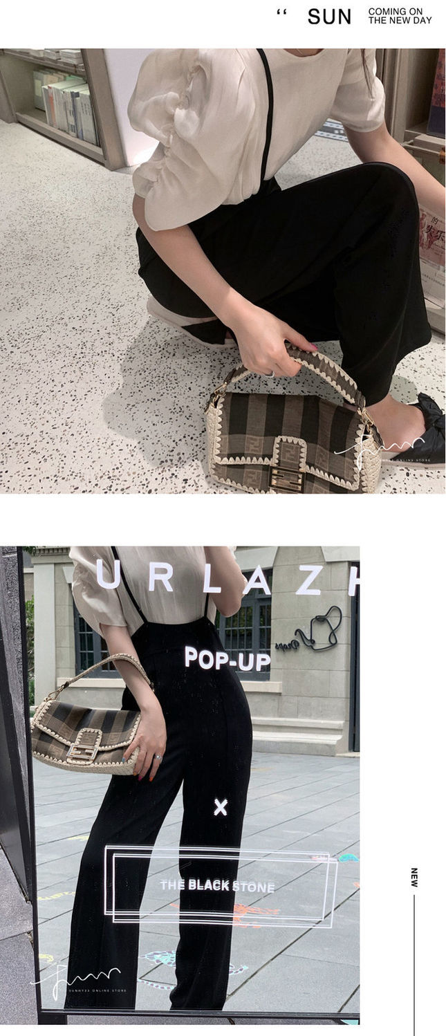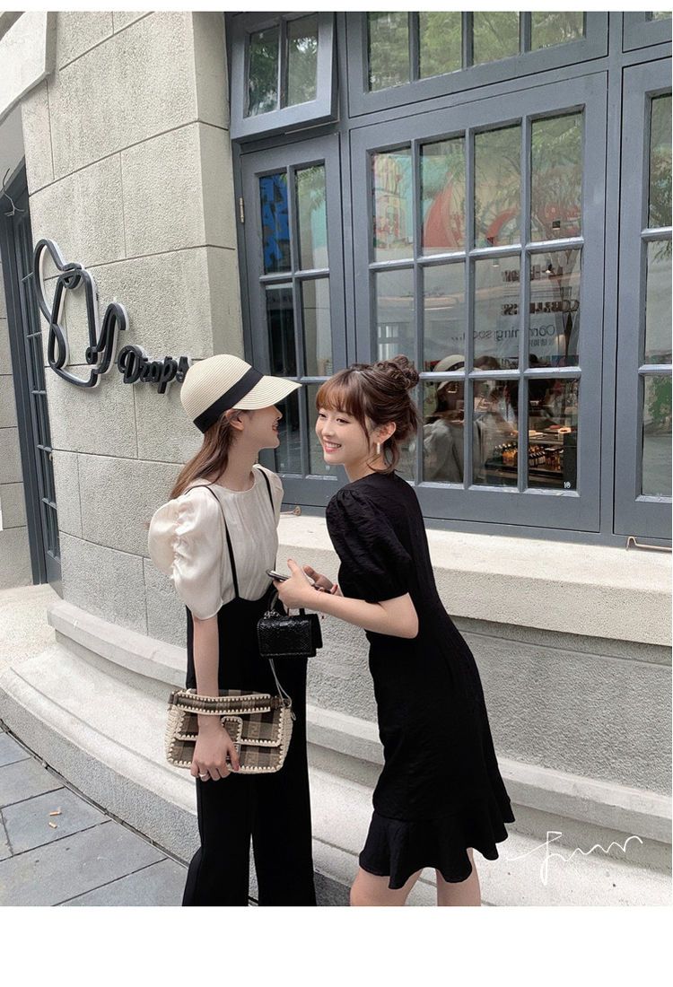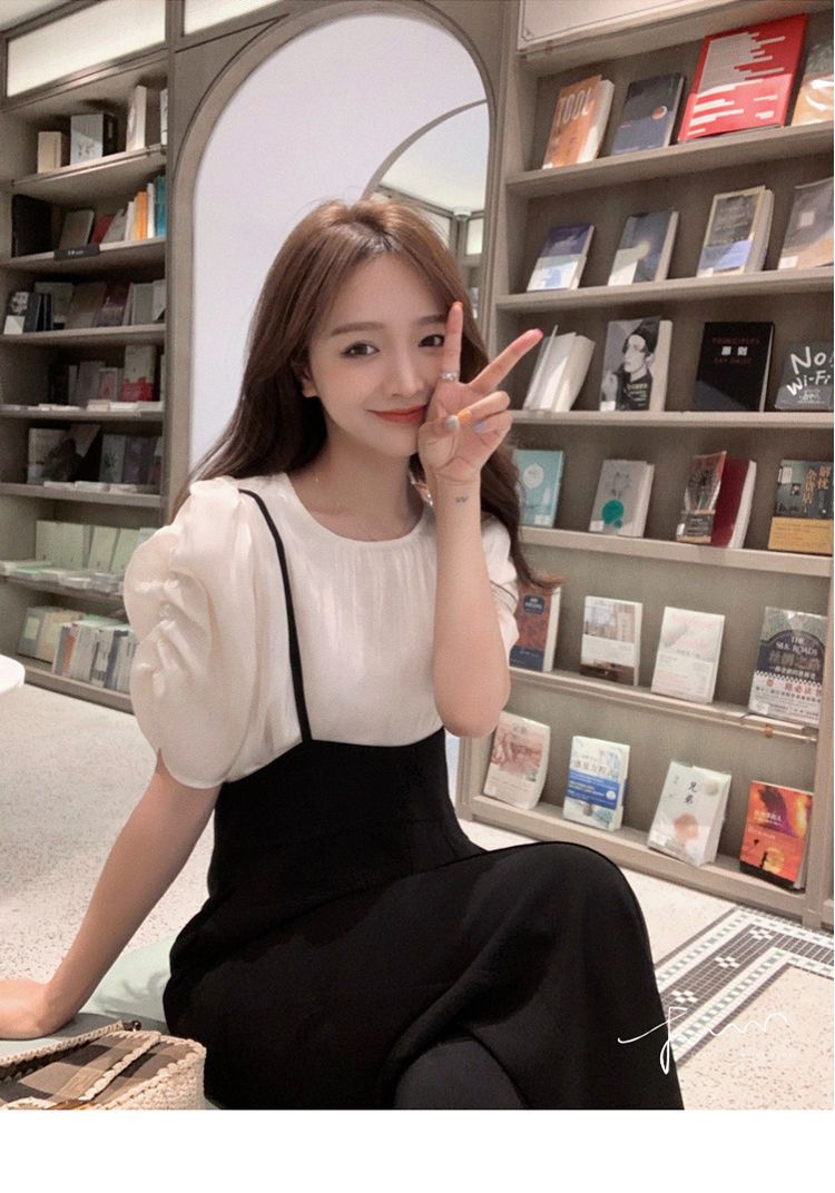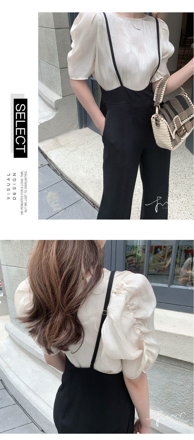 5. 時尚套裝女短袖褲裝韓版氣質泡泡袖高腰背帶褲顯瘦兩件套【時尚大衣櫥】