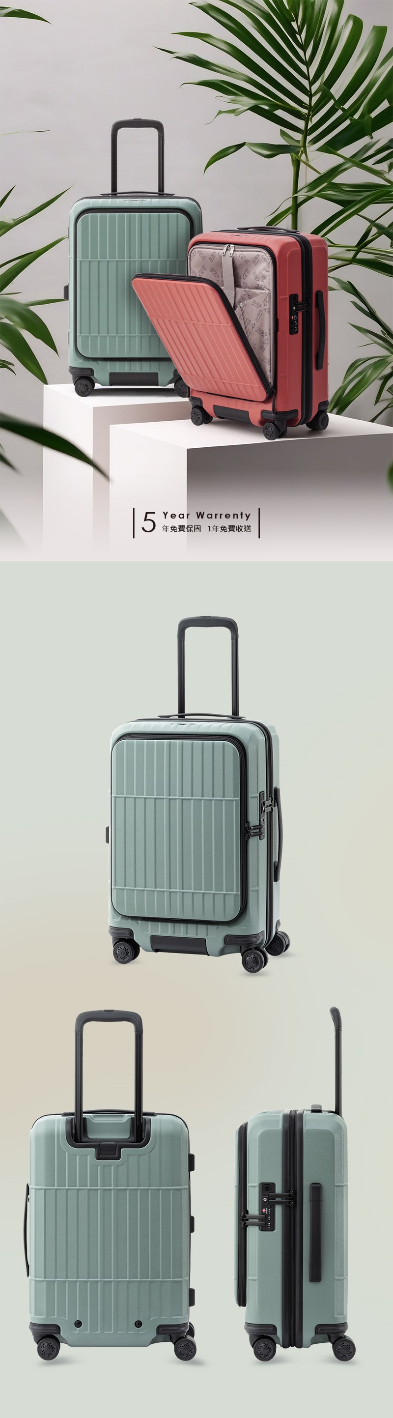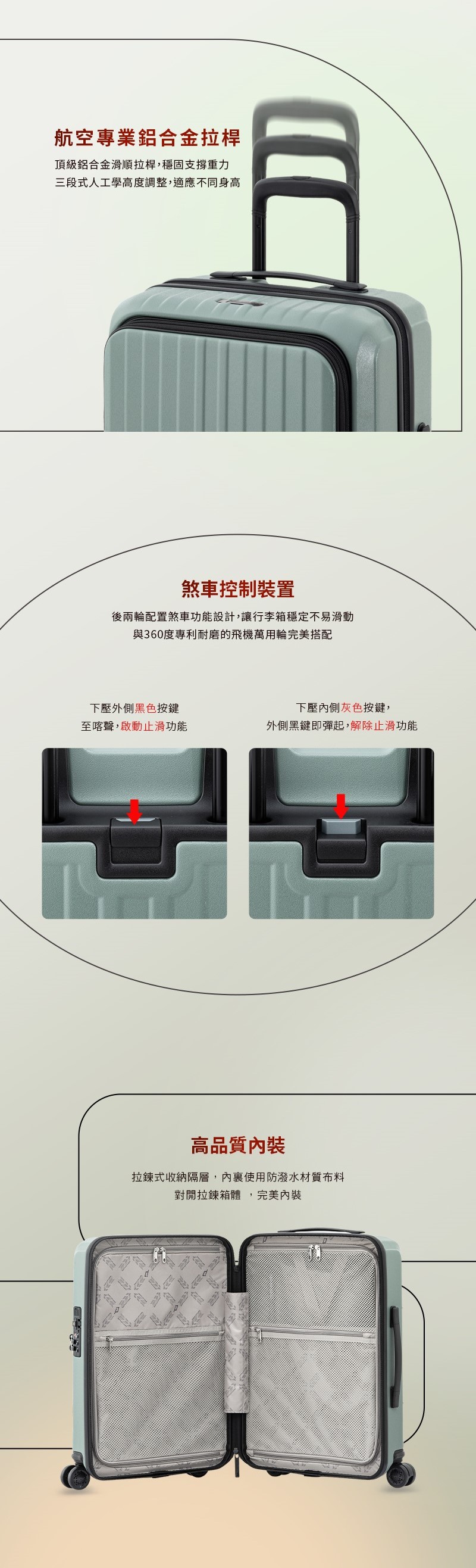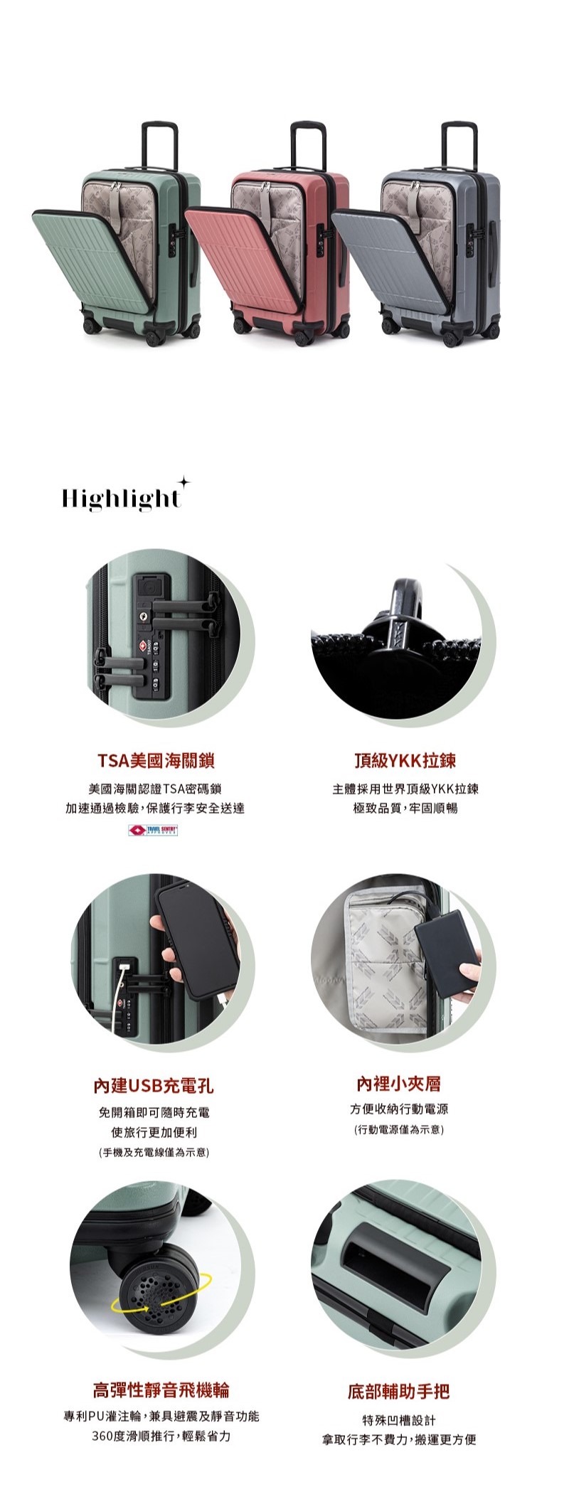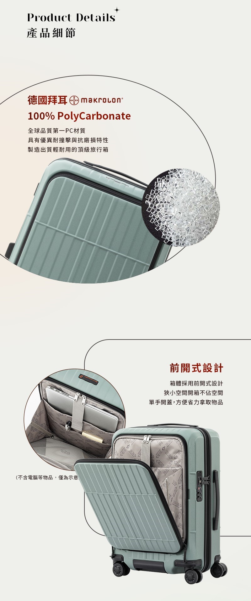 #100%德國拜耳PC外殼 #耐衝擊性佳 #1:9前開式,開箱不占空間 #滑順靜音飛機輪 #一鍵即煞