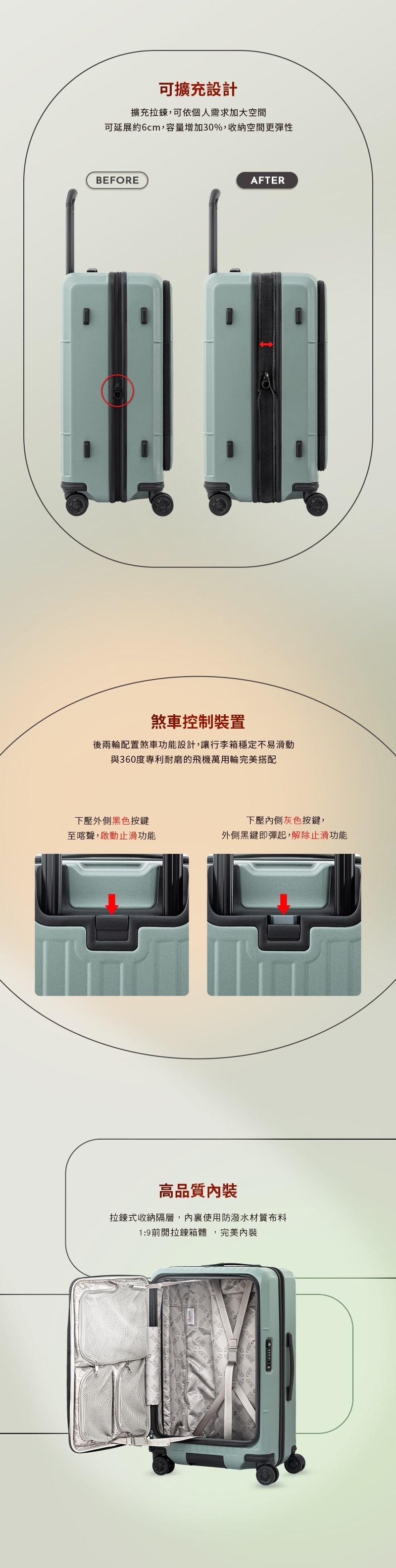 #100%德國拜耳PC外殼 #耐衝擊性佳 #1:9前開式,開箱不占空間 #滑順靜音飛機輪 #一鍵即煞
