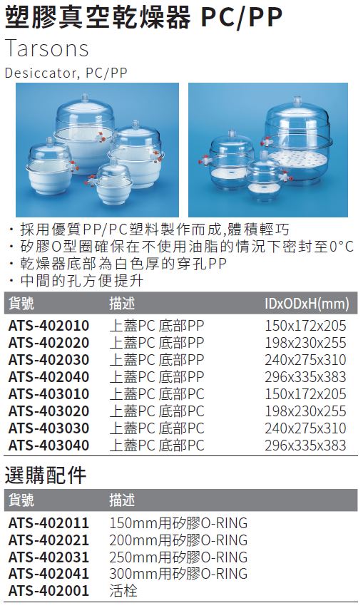 《Tarsons》塑膠真空乾燥器 PC/PP Desiccator, PC/PP