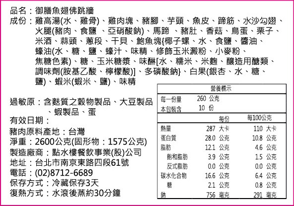 壓軸登場年菜至尊頂級,撼動人心的御膳魚翅佛跳牆,越頂級的食材,就要越原色原味呈現,如此更能經的起老饕品味,用足20多種好料,風味鮮醇不油膩。用料豐富、份量十足,精選上等水沙勾排翅(每甕放足三兩重),原味呈現,搭配排骨、豬腳、雞肉塊等選自本地當日屠宰之黑毛豬及土雞等新鮮肉品,且雞肉僅用腿肉部分,醃製入味後,與其他生鮮食材(水沙勾翅、鮮干貝、鮑魚、蹄筋、豬肚、百果、馬蹄、栗子、杏鮑菇、冬筍塊等),再加上老母雞湯共同入甕封口蒸煮約2.5小時。烹調過程皆由點水樓之行政主廚親自操刀,為的就是要給您,懷念的傳統江浙風味及一貫的品質。