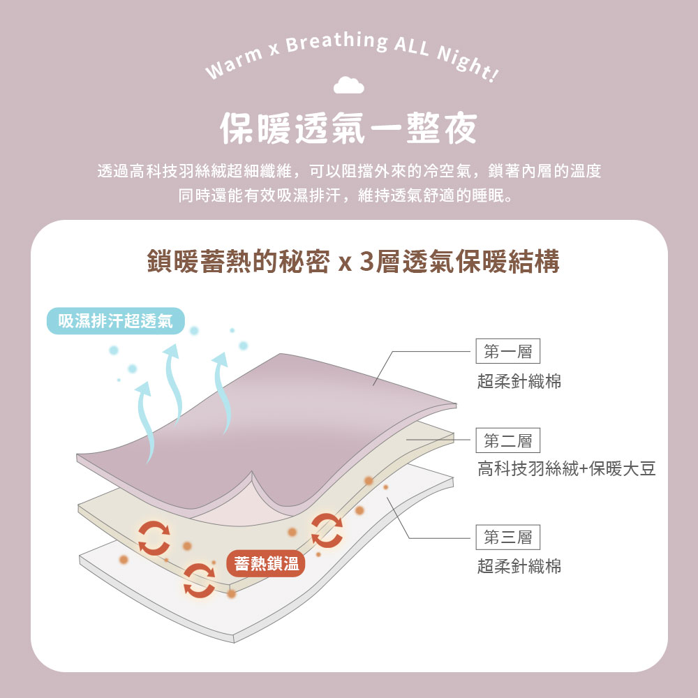 ▪填充物:20%大豆纖維+80%聚酯纖維(高品質羽絲絨)