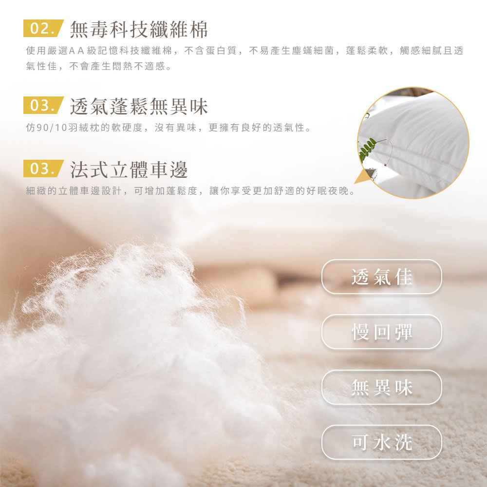 可水洗記憶科技羽絨枕:可機洗/避免漂白/不可烘乾/勿熨燙